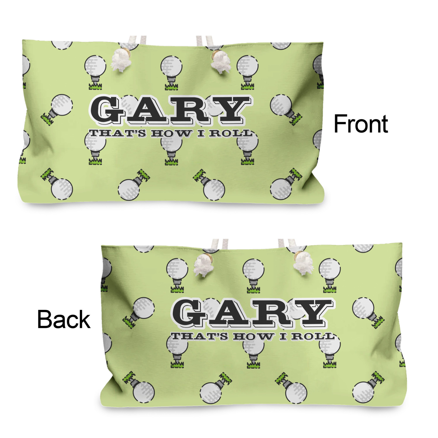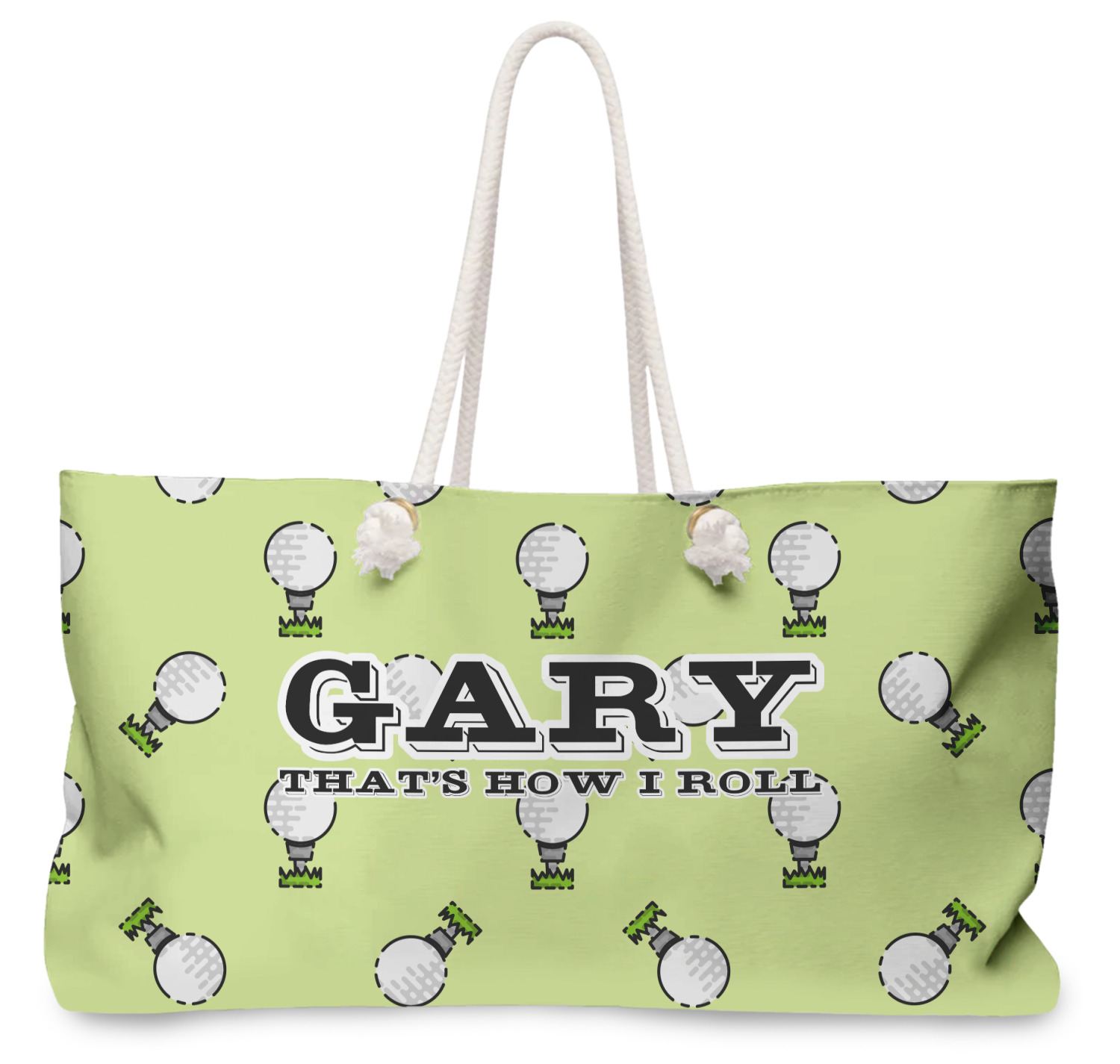 This design has a fun background that has illustrations of golf balls on a tee symmetrically placed to make a fun pattern. The main colors are a light lime green with a little dark green and white. The text is easily changed to whatever you like. The default has a place for a name as well as the phrase "that's how I roll" to get a good laugh out of your buddies. This is a fun design to use on your golfing gear.