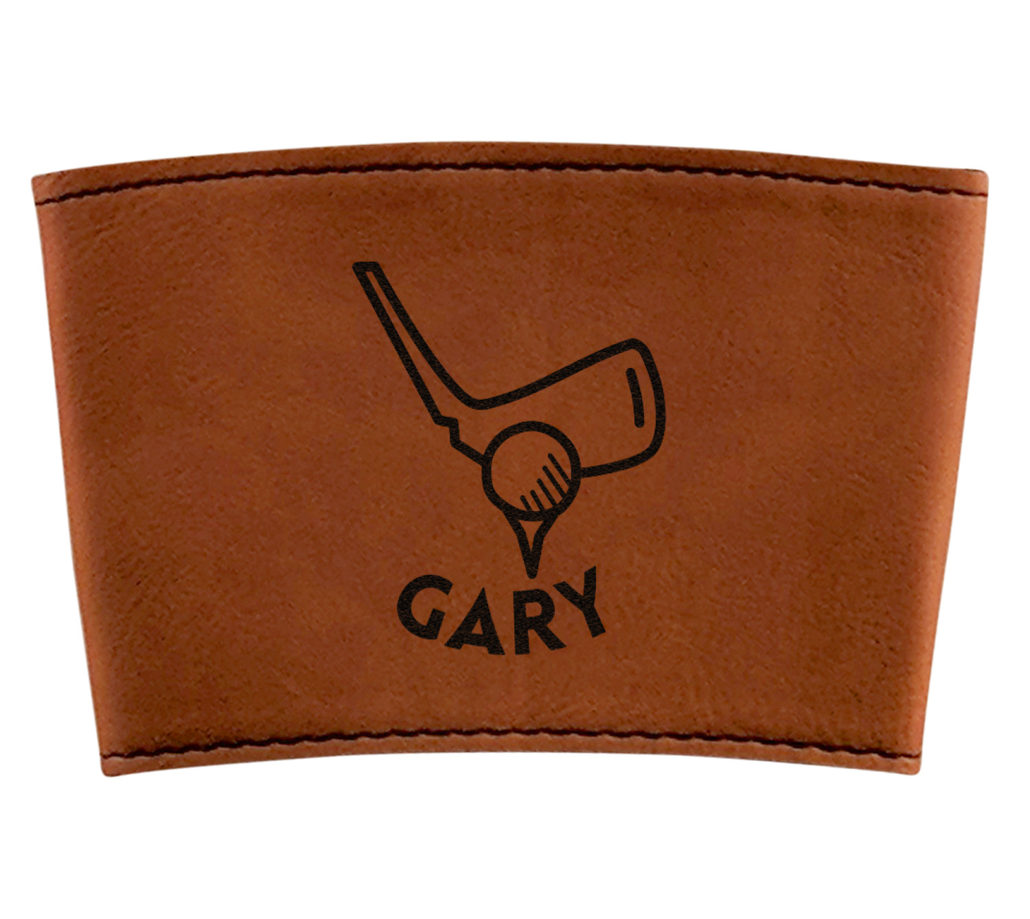 This cup sleeve is made from a suave, cognac-brown leatherette and finished with an intricate, black stitch. The interior of this can sleeve is fabricated from a thin foam material to help insulate your mug's contents. The sleeve is specifically made to suit tapered glasses or mugs, so the top's diameter is 3.5 inches, while the bottom's diameter is 2.75 inches. Your customized design will be laser engraved into the leatherette, leaving behind crisp, black imprint. With these products, we provide you with the option of engraving the front and back, or the front only.
