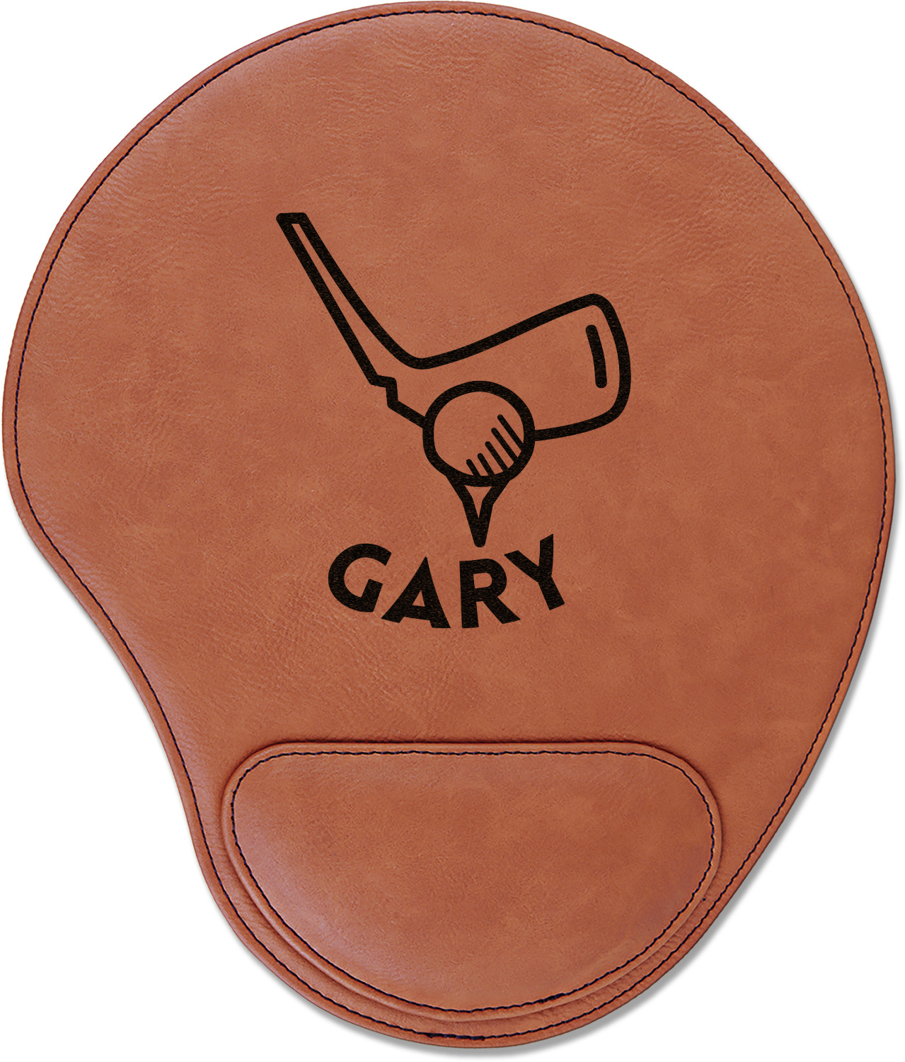 In a rounded shape, this mouse pad is made of a luxurious, cognac-colored leatherette. The nature of this material allows your mouse to glide smoothly across its surface. Strong stitching lines the edges to guarantee stability and strength. As added support for tired wrists, your personalized mouse pad features a supportive wrist rest at its bottom. This model measures at 10.25" x 9", while its wrist pad is approximately 5" x 2.75", with a thickness of 0.75". Your personalized design is laser engraved into the front face of this mouse pad.
