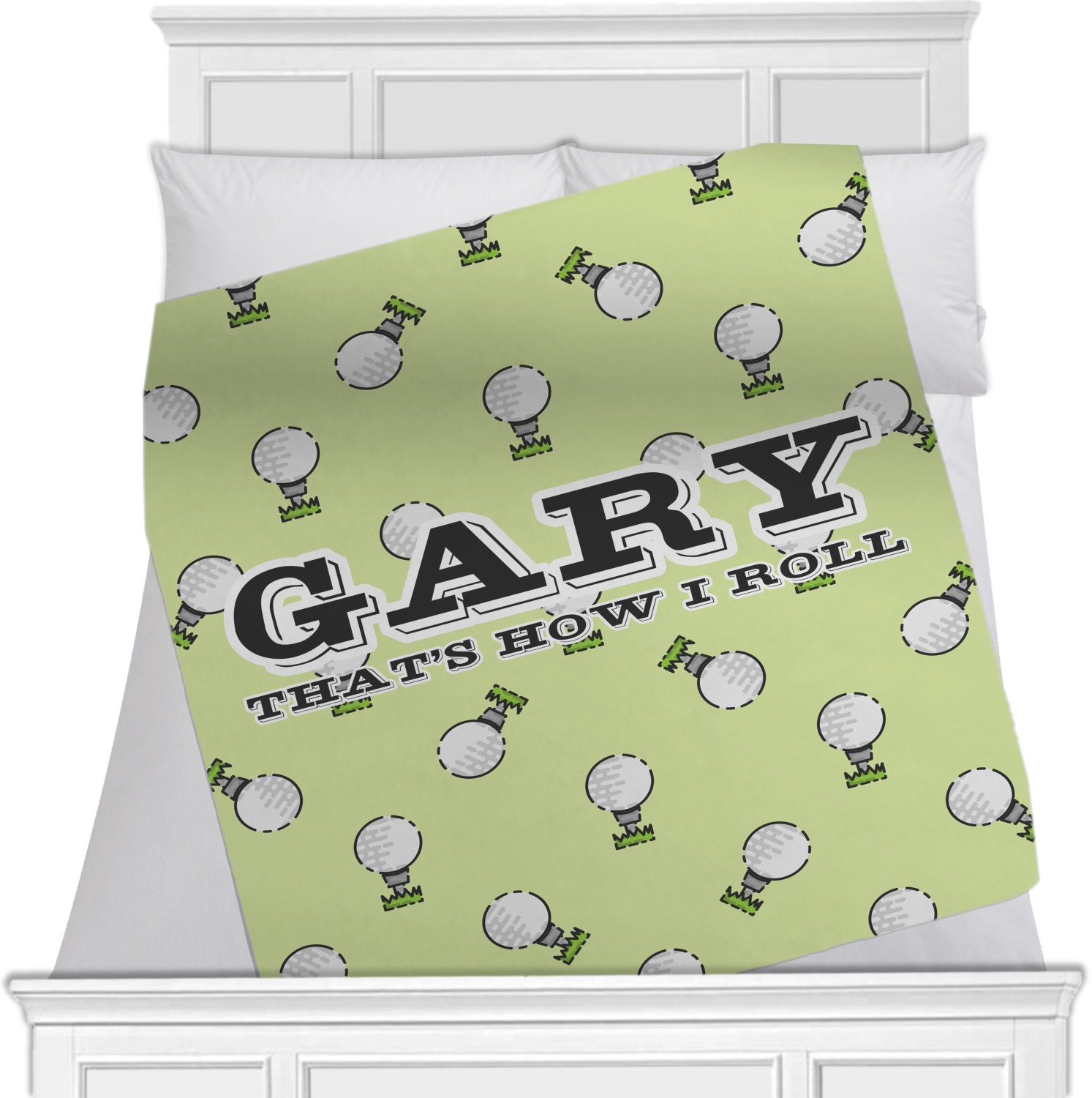 This design has a fun background that has illustrations of golf balls on a tee symmetrically placed to make a fun pattern. The main colors are a light lime green with a little dark green and white. The text is easily changed to whatever you like. The default has a place for a name as well as the phrase "that's how I roll" to get a good laugh out of your buddies. This is a fun design to use on your golfing gear.