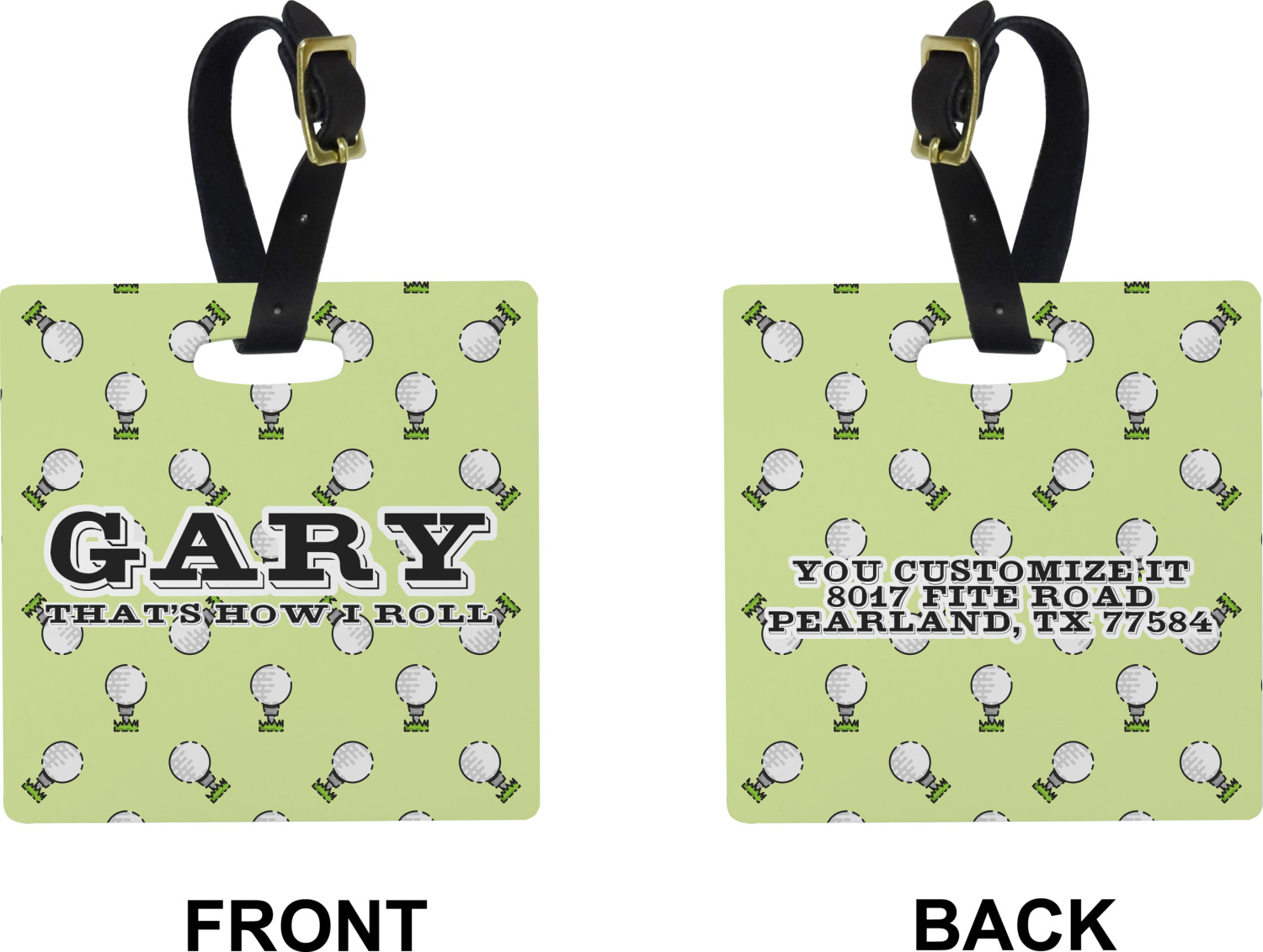 These personalized bag tags are sold in a variety of shapes, so that you may find the product that meets your vision exactly. We sell a round luggage tag, which measures at approximately 4" x 4". Our square luggage tag is about 3.5" x 3.5", while our rectangular version is 2.75" x 4 ".