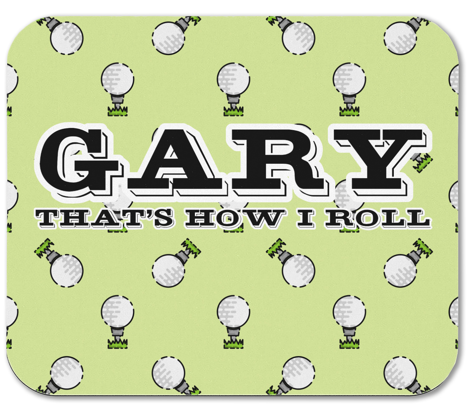 This design has a fun background that has illustrations of golf balls on a tee symmetrically placed to make a fun pattern. The main colors are a light lime green with a little dark green and white. The text is easily changed to whatever you like. The default has a place for a name as well as the phrase "that's how I roll" to get a good laugh out of your buddies. This is a fun design to use on your golfing gear.