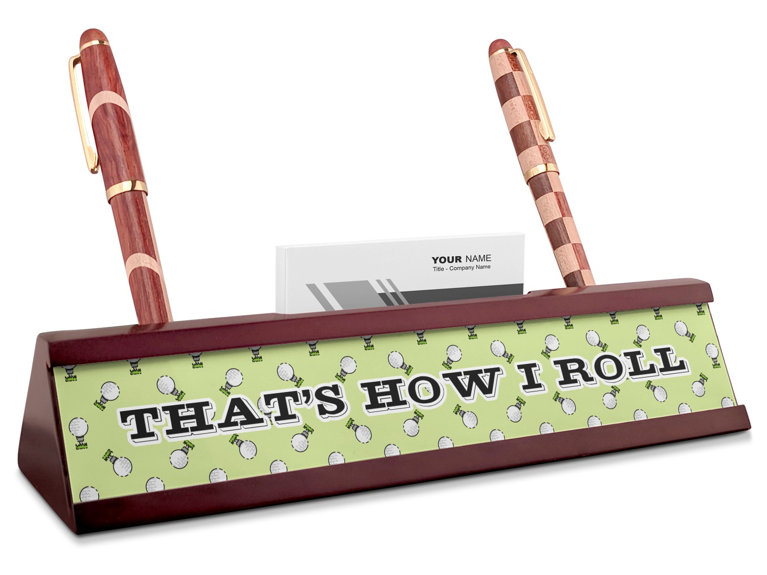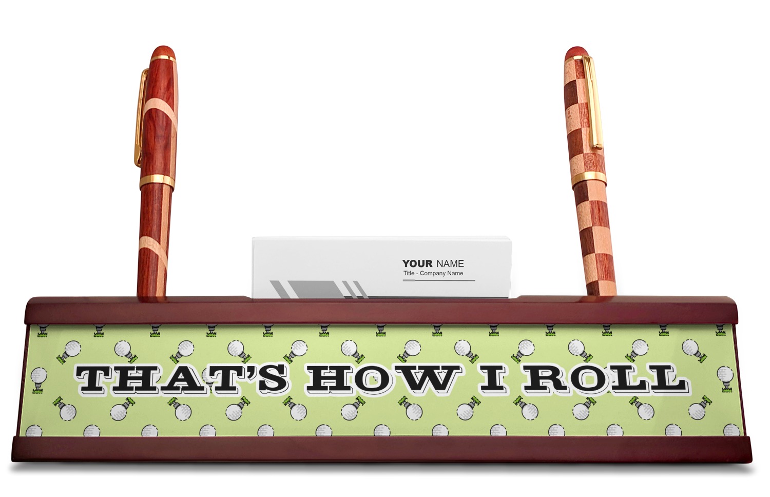 This design has a fun background that has illustrations of golf balls on a tee symmetrically placed to make a fun pattern. The main colors are a light lime green with a little dark green and white. The text is easily changed to whatever you like. The default has a place for a name as well as the phrase "that's how I roll" to get a good laugh out of your buddies. This is a fun design to use on your golfing gear.