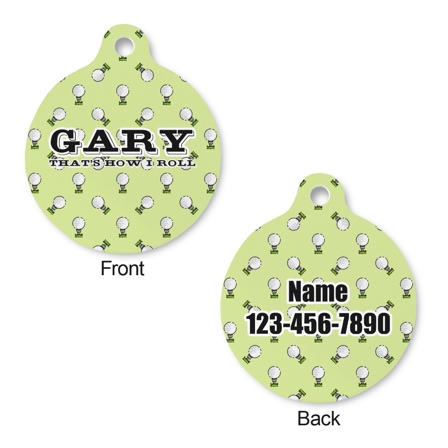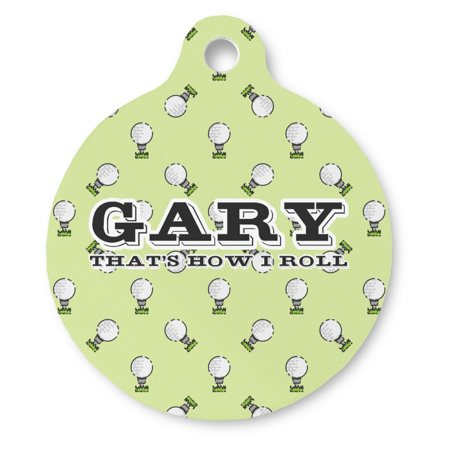 This design has a fun background that has illustrations of golf balls on a tee symmetrically placed to make a fun pattern. The main colors are a light lime green with a little dark green and white. The text is easily changed to whatever you like. The default has a place for a name as well as the phrase "that's how I roll" to get a good laugh out of your buddies. This is a fun design to use on your golfing gear.