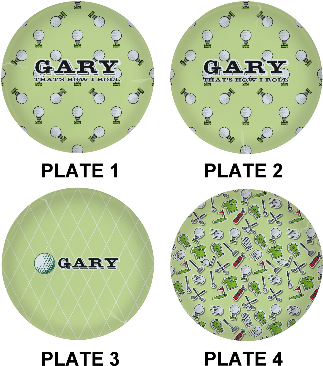 This design has a fun background that has illustrations of golf balls on a tee symmetrically placed to make a fun pattern. The main colors are a light lime green with a little dark green and white. The text is easily changed to whatever you like. The default has a place for a name as well as the phrase "that's how I roll" to get a good laugh out of your buddies. This is a fun design to use on your golfing gear.