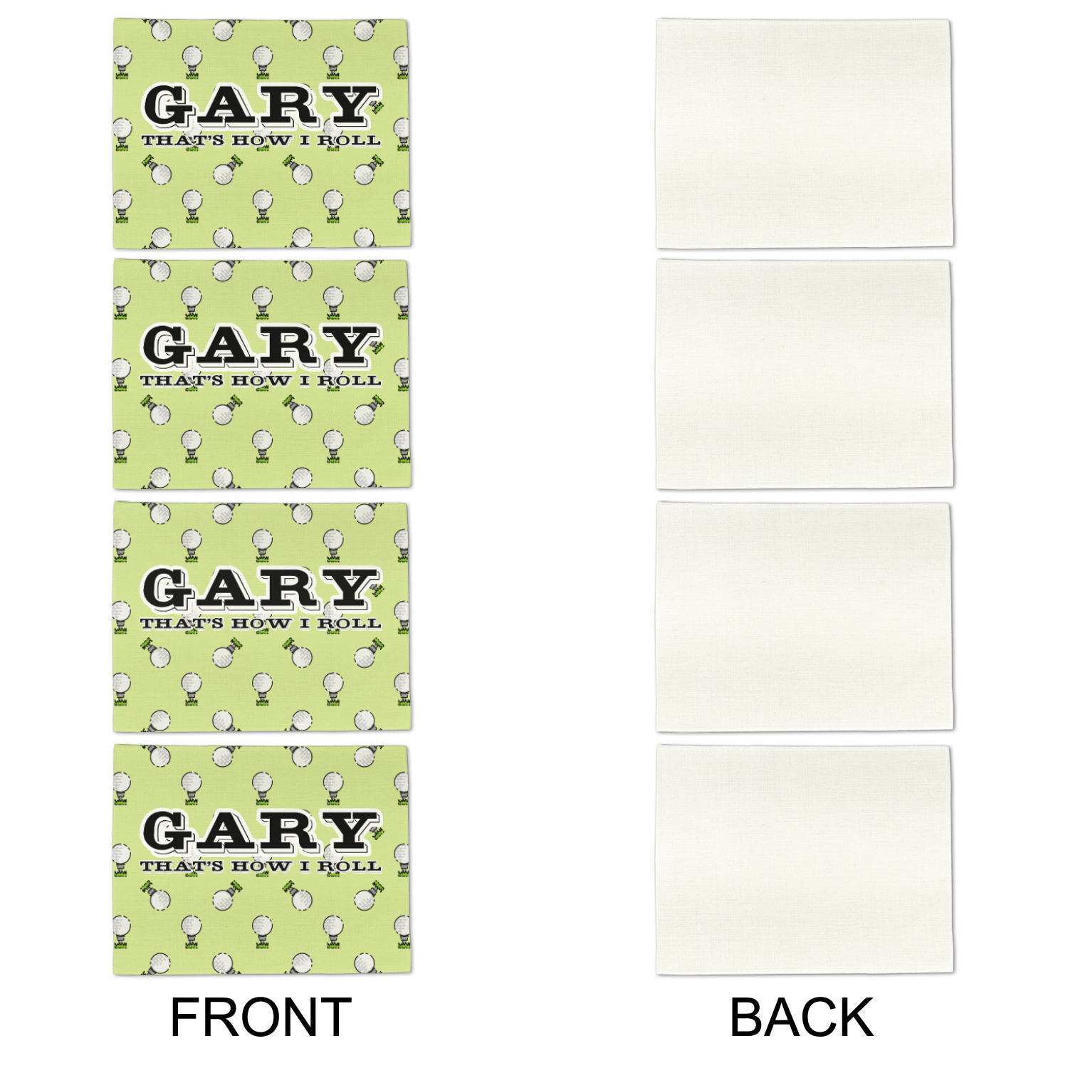 This design has a fun background that has illustrations of golf balls on a tee symmetrically placed to make a fun pattern. The main colors are a light lime green with a little dark green and white. The text is easily changed to whatever you like. The default has a place for a name as well as the phrase "that's how I roll" to get a good laugh out of your buddies. This is a fun design to use on your golfing gear.