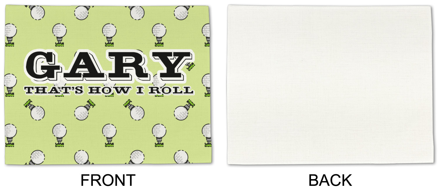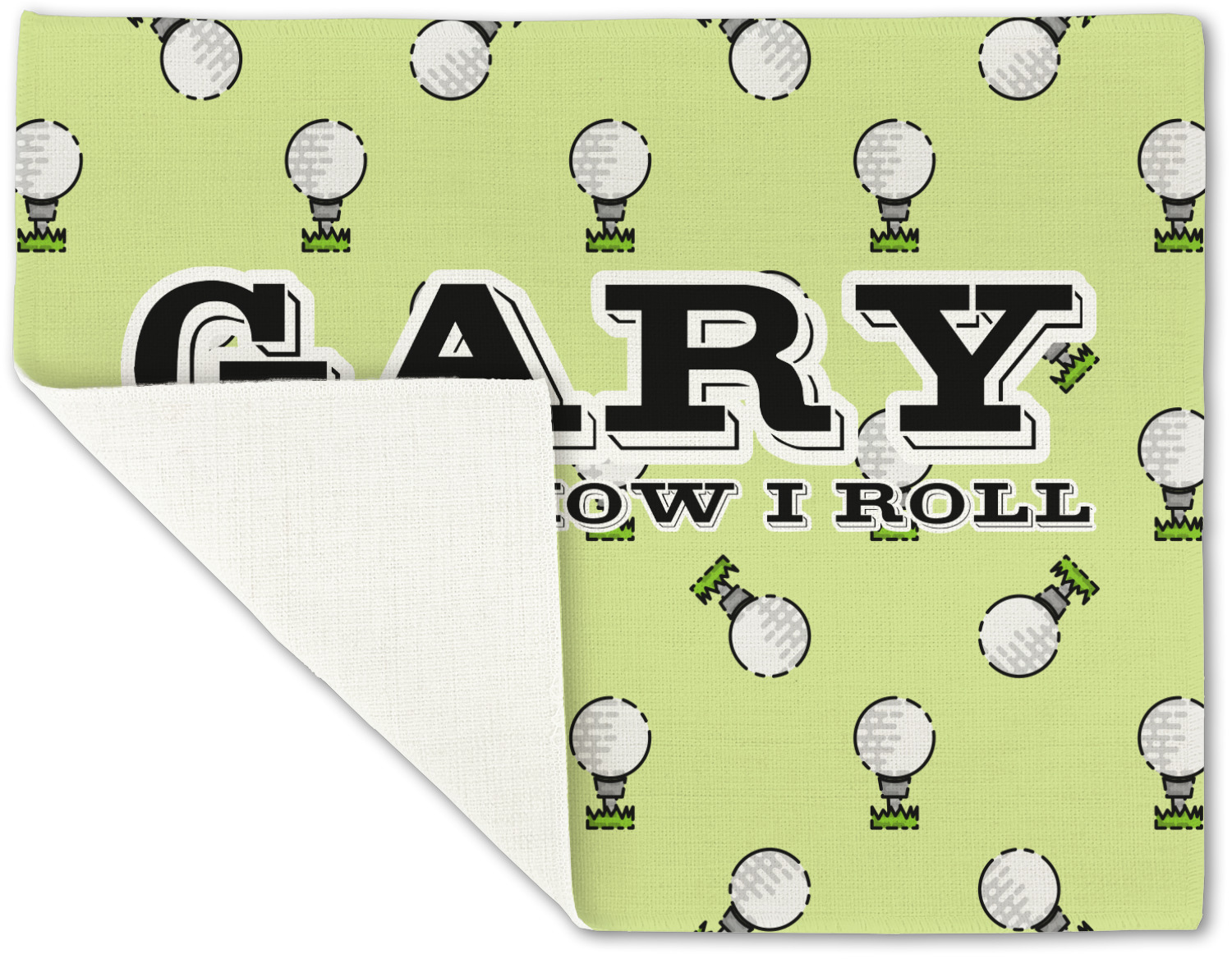 This design has a fun background that has illustrations of golf balls on a tee symmetrically placed to make a fun pattern. The main colors are a light lime green with a little dark green and white. The text is easily changed to whatever you like. The default has a place for a name as well as the phrase "that's how I roll" to get a good laugh out of your buddies. This is a fun design to use on your golfing gear.