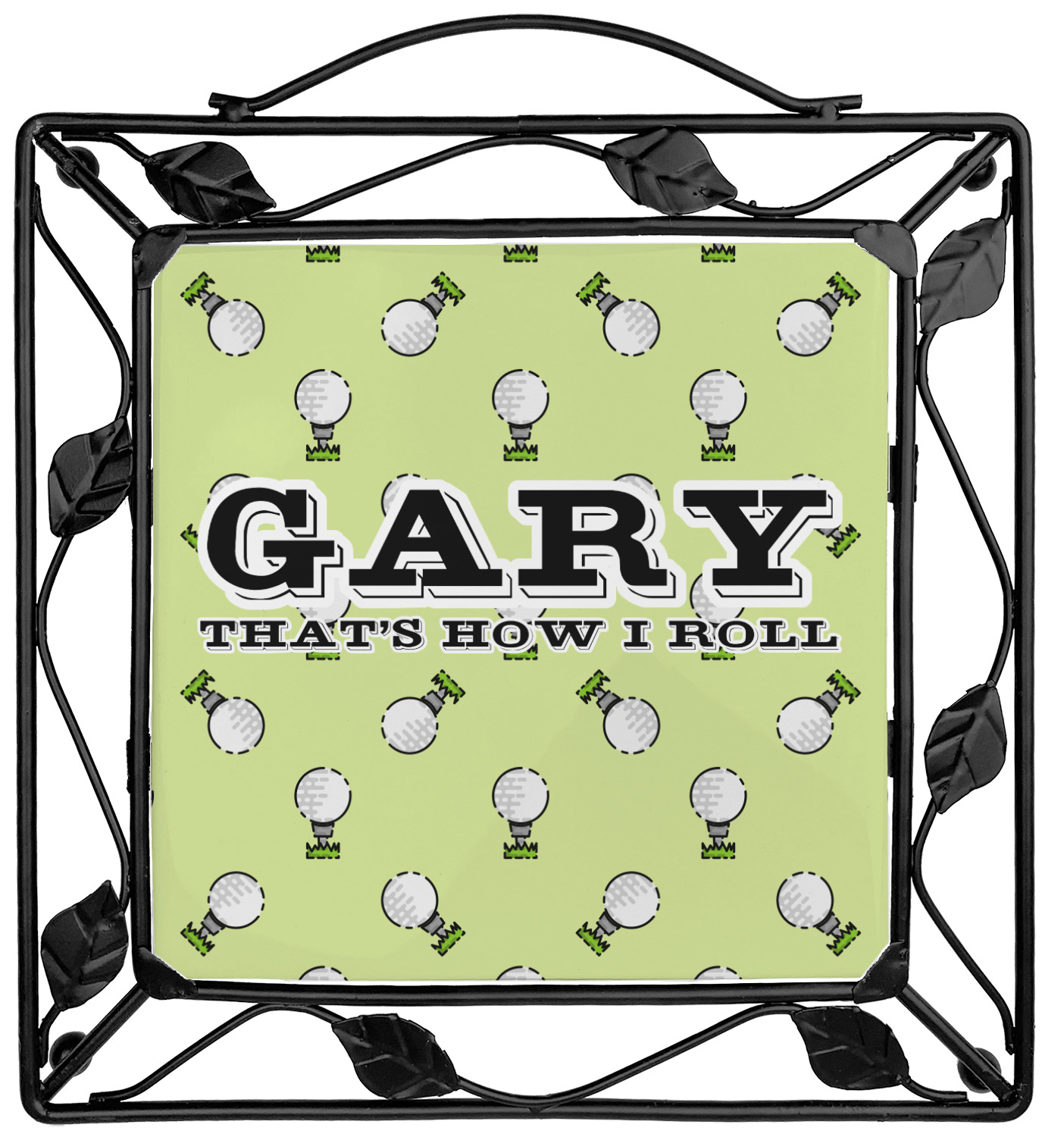 Our square trivets are made from a durable, wrought iron. This model features 4 small half circles, one on each corner, and a larger ring of iron that circles the central, customized tile. Each of the 4 corners has a round foot on its bottom for stability. This trivet is 8.75 by 8.75 inches, but the central tile measures at 6 inches on both sides.