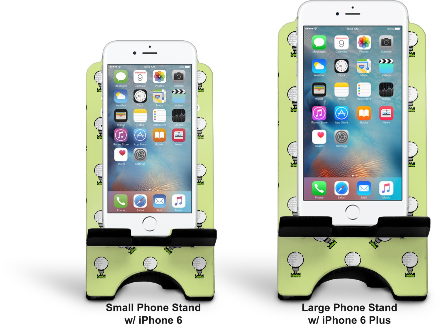 To meet your needs, we offer four variations of this IPhone stand. The backboard of the first version is shaped as a plain, yet sleek rectangle, and is available in two sizes. Our smaller size is approximately 4 by 3.25 by 7 inches, while the larger model is 4 by 3.77 by 8.5 inches. Alongside this model, we also provide you with a more decorative option. The upper part of our second version features a curved edge, for a classy, suave appearance. This phone holder is also sold in two sizes: a smaller version, which is 4 by 3.25 by 7 inches, and our larger model, which is 4 by 3.77 by 8.5 inches. Both models will support large phones, but the larger model is better if you wish to proudly display your personalized design.