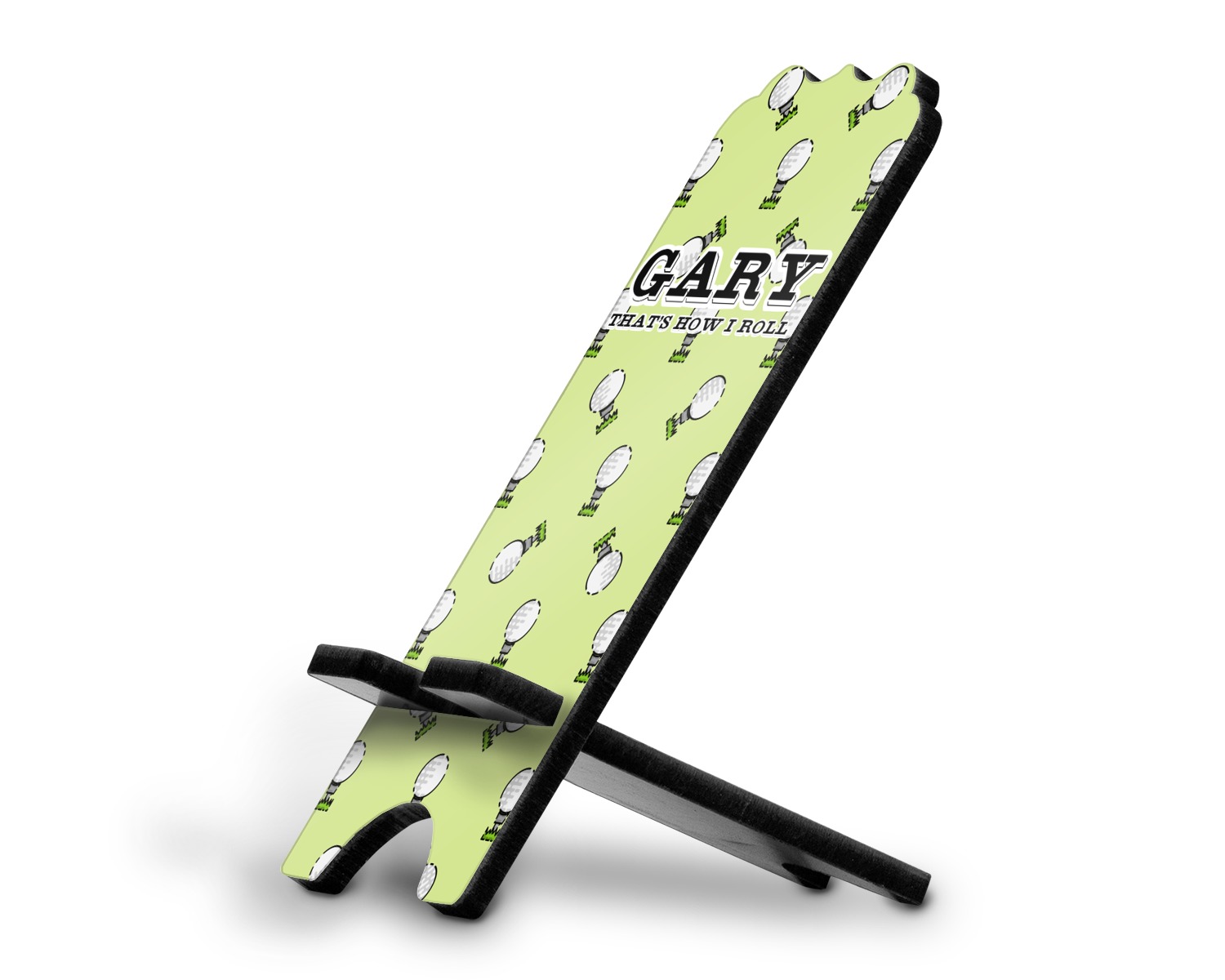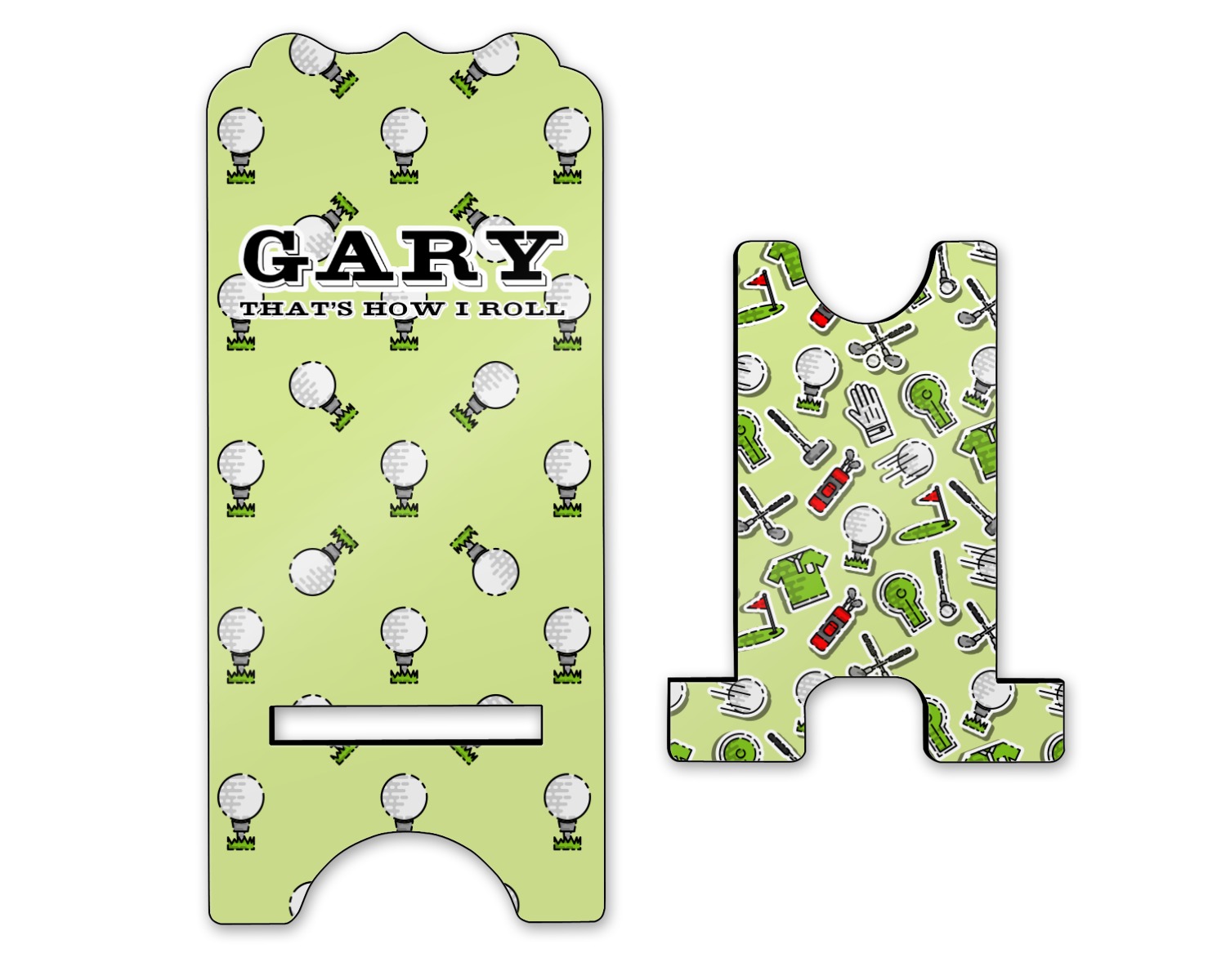 This design has a fun background that has illustrations of golf balls on a tee symmetrically placed to make a fun pattern. The main colors are a light lime green with a little dark green and white. The text is easily changed to whatever you like. The default has a place for a name as well as the phrase "that's how I roll" to get a good laugh out of your buddies. This is a fun design to use on your golfing gear.