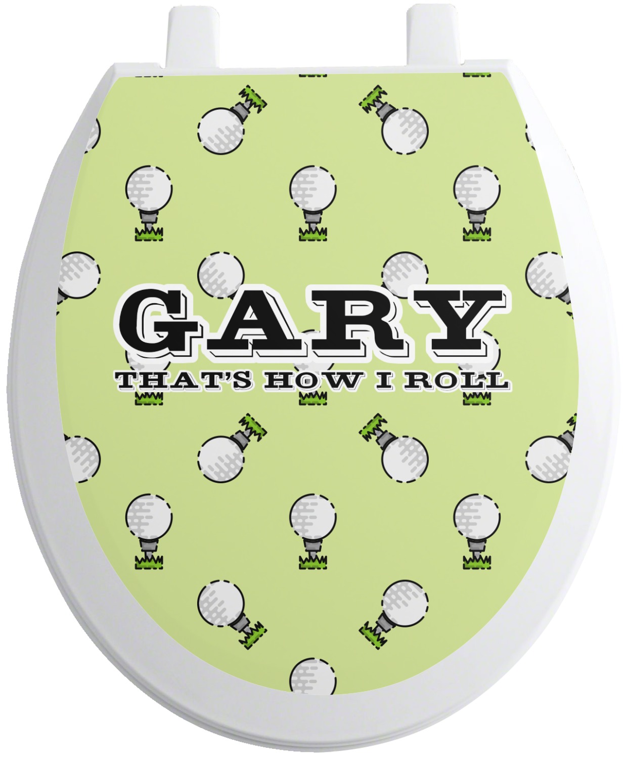 This design has a fun background that has illustrations of golf balls on a tee symmetrically placed to make a fun pattern. The main colors are a light lime green with a little dark green and white. The text is easily changed to whatever you like. The default has a place for a name as well as the phrase "that's how I roll" to get a good laugh out of your buddies. This is a fun design to use on your golfing gear.