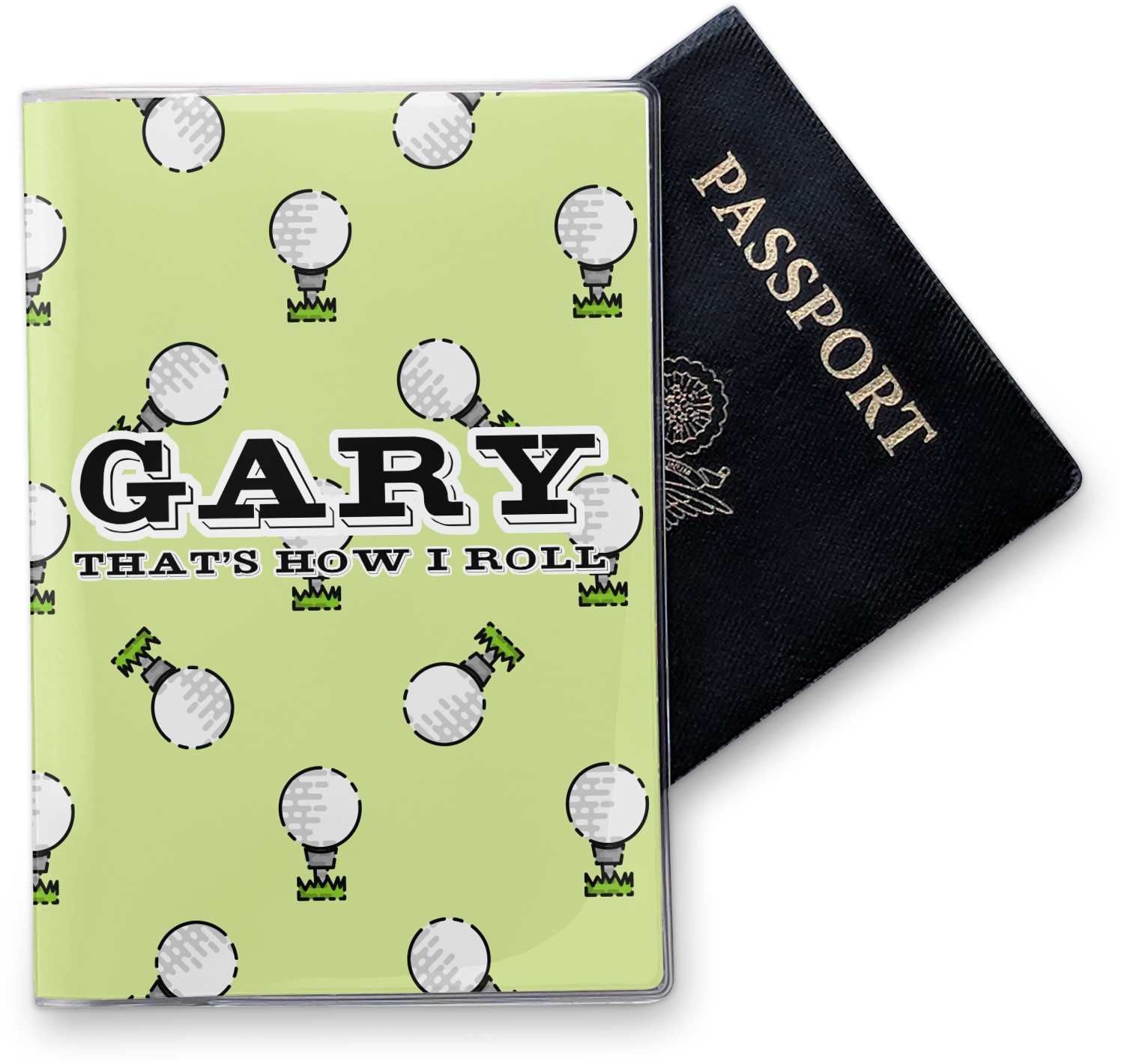 This design has a fun background that has illustrations of golf balls on a tee symmetrically placed to make a fun pattern. The main colors are a light lime green with a little dark green and white. The text is easily changed to whatever you like. The default has a place for a name as well as the phrase "that's how I roll" to get a good laugh out of your buddies. This is a fun design to use on your golfing gear.