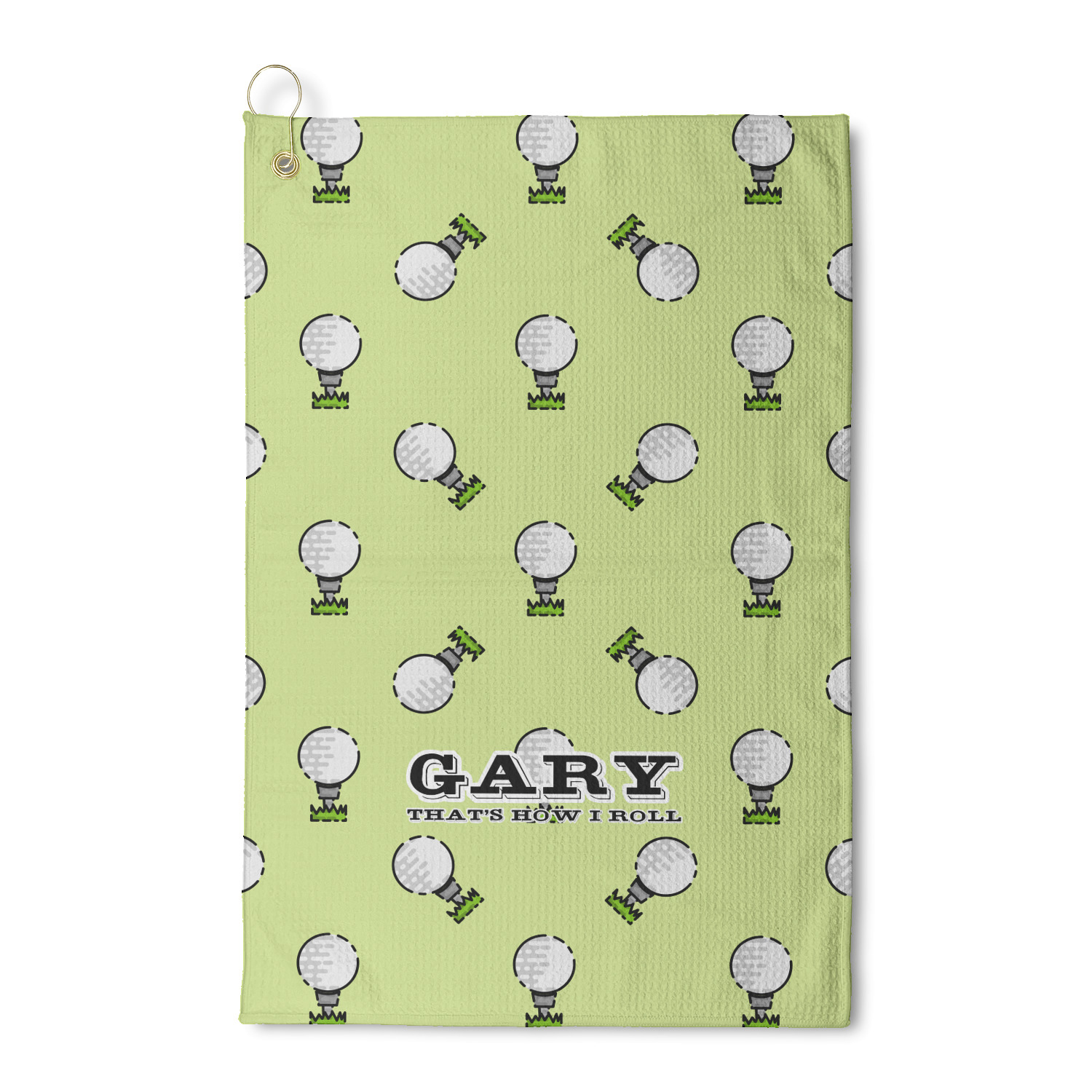 This design has a fun background that has illustrations of golf balls on a tee symmetrically placed to make a fun pattern. The main colors are a light lime green with a little dark green and white. The text is easily changed to whatever you like. The default has a place for a name as well as the phrase "that's how I roll" to get a good laugh out of your buddies. This is a fun design to use on your golfing gear.