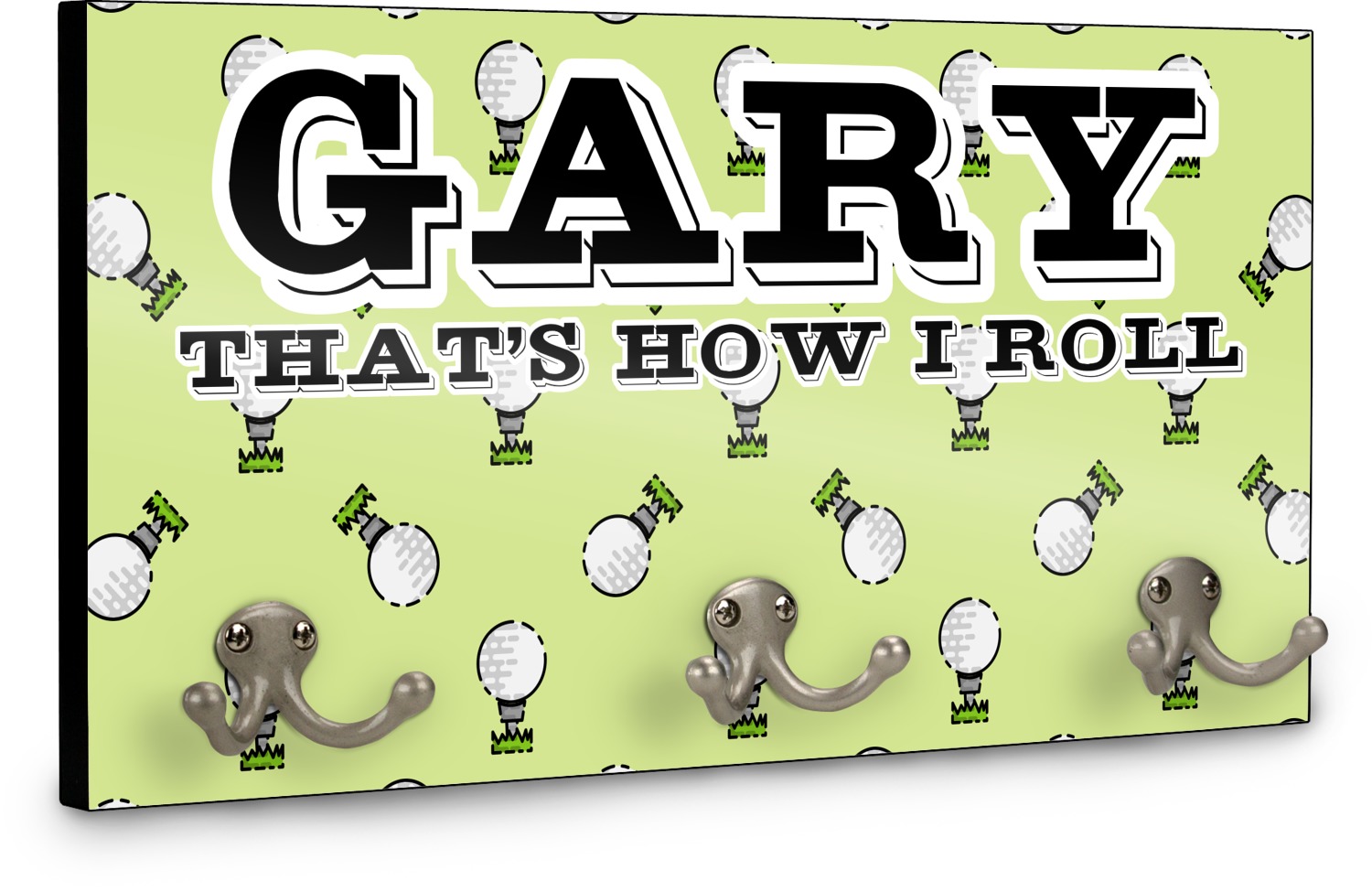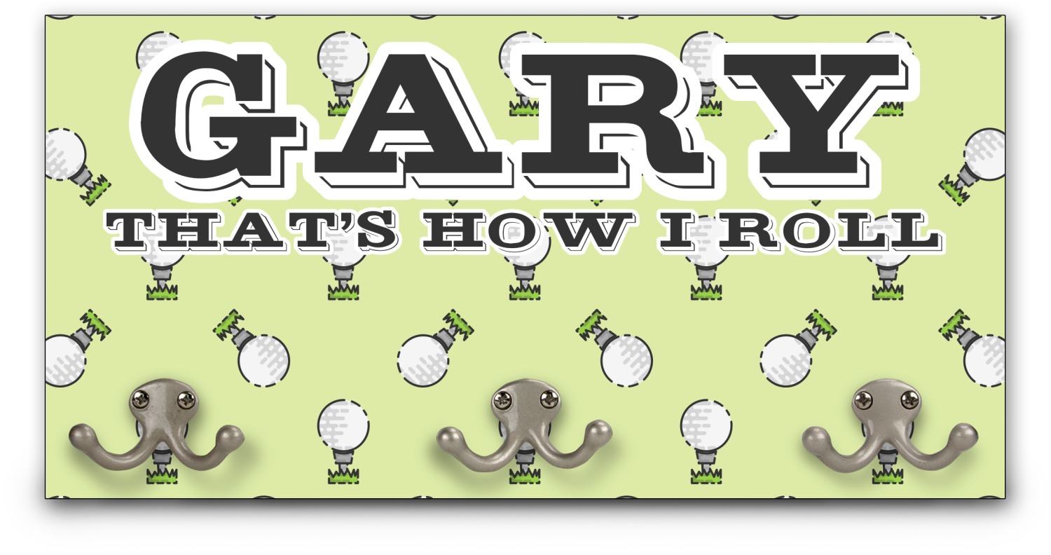 This design has a fun background that has illustrations of golf balls on a tee symmetrically placed to make a fun pattern. The main colors are a light lime green with a little dark green and white. The text is easily changed to whatever you like. The default has a place for a name as well as the phrase "that's how I roll" to get a good laugh out of your buddies. This is a fun design to use on your golfing gear.