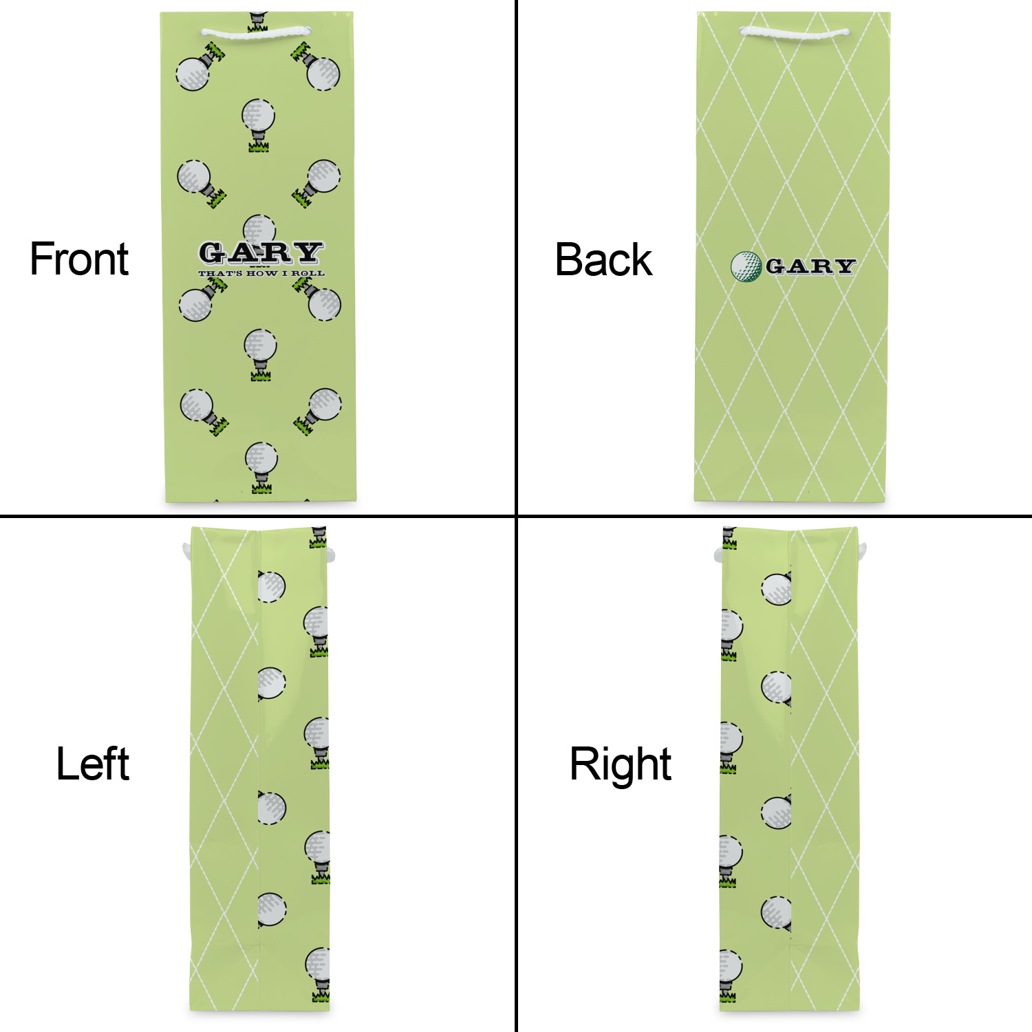 This design has a fun background that has illustrations of golf balls on a tee symmetrically placed to make a fun pattern. The main colors are a light lime green with a little dark green and white. The text is easily changed to whatever you like. The default has a place for a name as well as the phrase "that's how I roll" to get a good laugh out of your buddies. This is a fun design to use on your golfing gear.