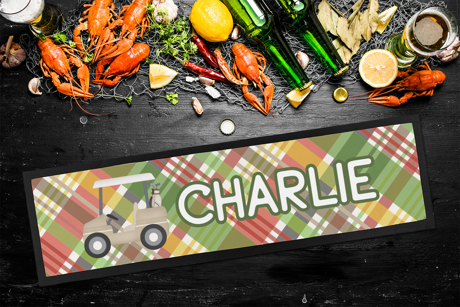The background in this design is a diagonal plaid that has muted green, red, cream, and yellow. In the center is a fun vintage texture frame with a golf cart illustration and your personalization underneath. The coordinating design has a fun golf ball pattern with a victorious laurel wreath framing your personalization. This is the perfect design for any guy who loves golf.