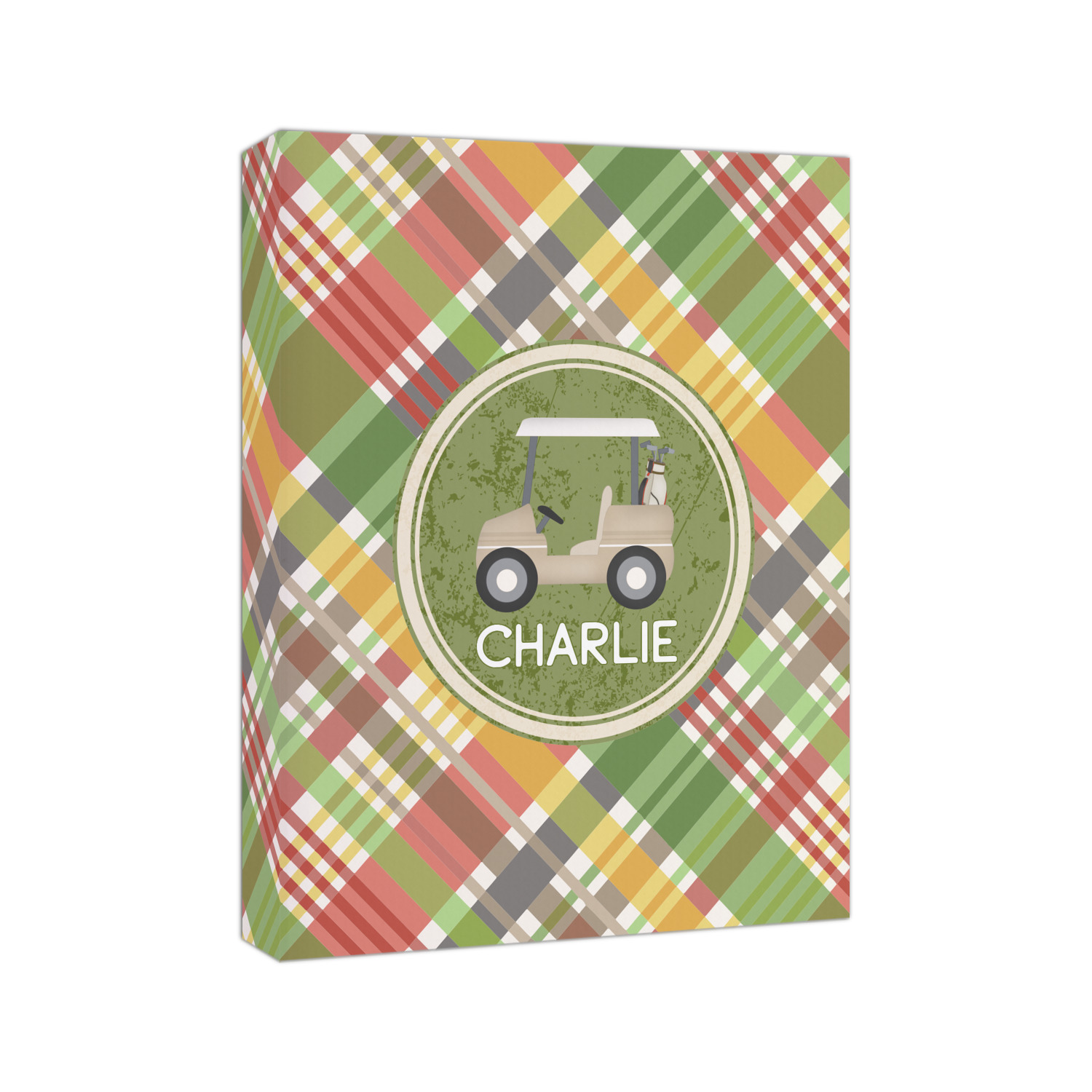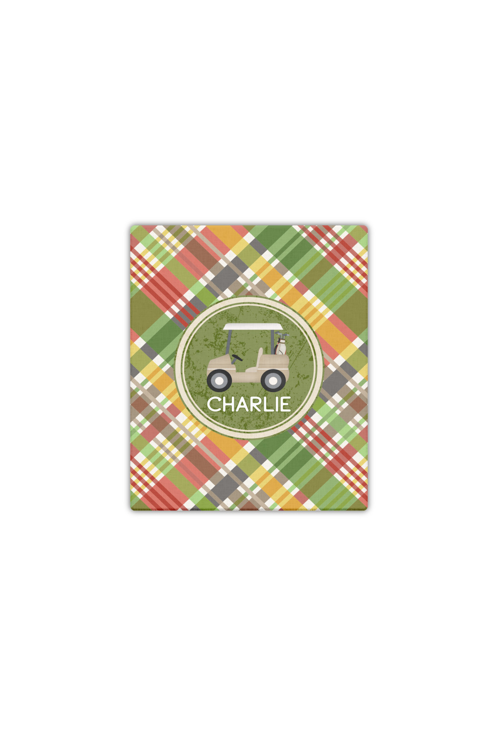 The background in this design is a diagonal plaid that has muted green, red, cream, and yellow. In the center is a fun vintage texture frame with a golf cart illustration and your personalization underneath. The coordinating design has a fun golf ball pattern with a victorious laurel wreath framing your personalization. This is the perfect design for any guy who loves golf.
