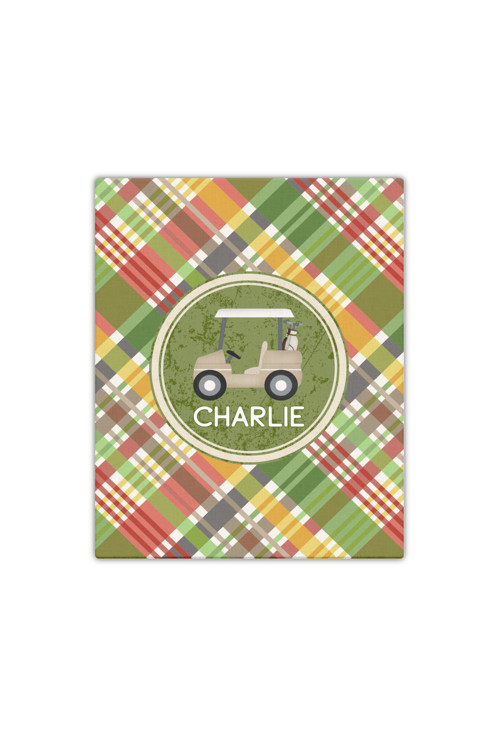 The background in this design is a diagonal plaid that has muted green, red, cream, and yellow. In the center is a fun vintage texture frame with a golf cart illustration and your personalization underneath. The coordinating design has a fun golf ball pattern with a victorious laurel wreath framing your personalization. This is the perfect design for any guy who loves golf.