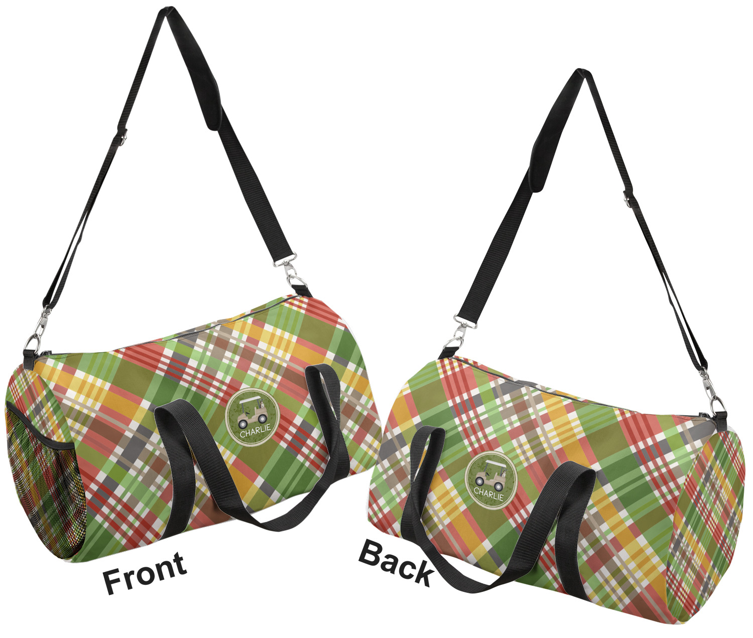 This duffle is a sturdy bag made of a canvas material. It comes in two sizes: Small (19"W x 9.5"H x 9.5"D) and Large (23"W x 12"H x 12"D). The bag is a cylindrical shape with a black adjustable strap and two handles. On one side is an elastic pouch to put a waterbottle or other small item. Your product will be sublimated with your design and is able to be designed on the front, back, and sides. Be sure to remember that the straps may cut into parts of your design if you upload your own artwork.