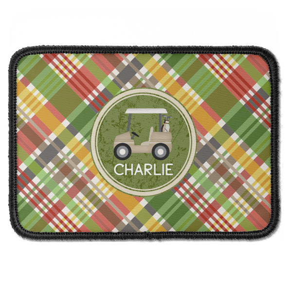 The background in this design is a diagonal plaid that has muted green, red, cream, and yellow. In the center is a fun vintage texture frame with a golf cart illustration and your personalization underneath. The coordinating design has a fun golf ball pattern with a victorious laurel wreath framing your personalization. This is the perfect design for any guy who loves golf.