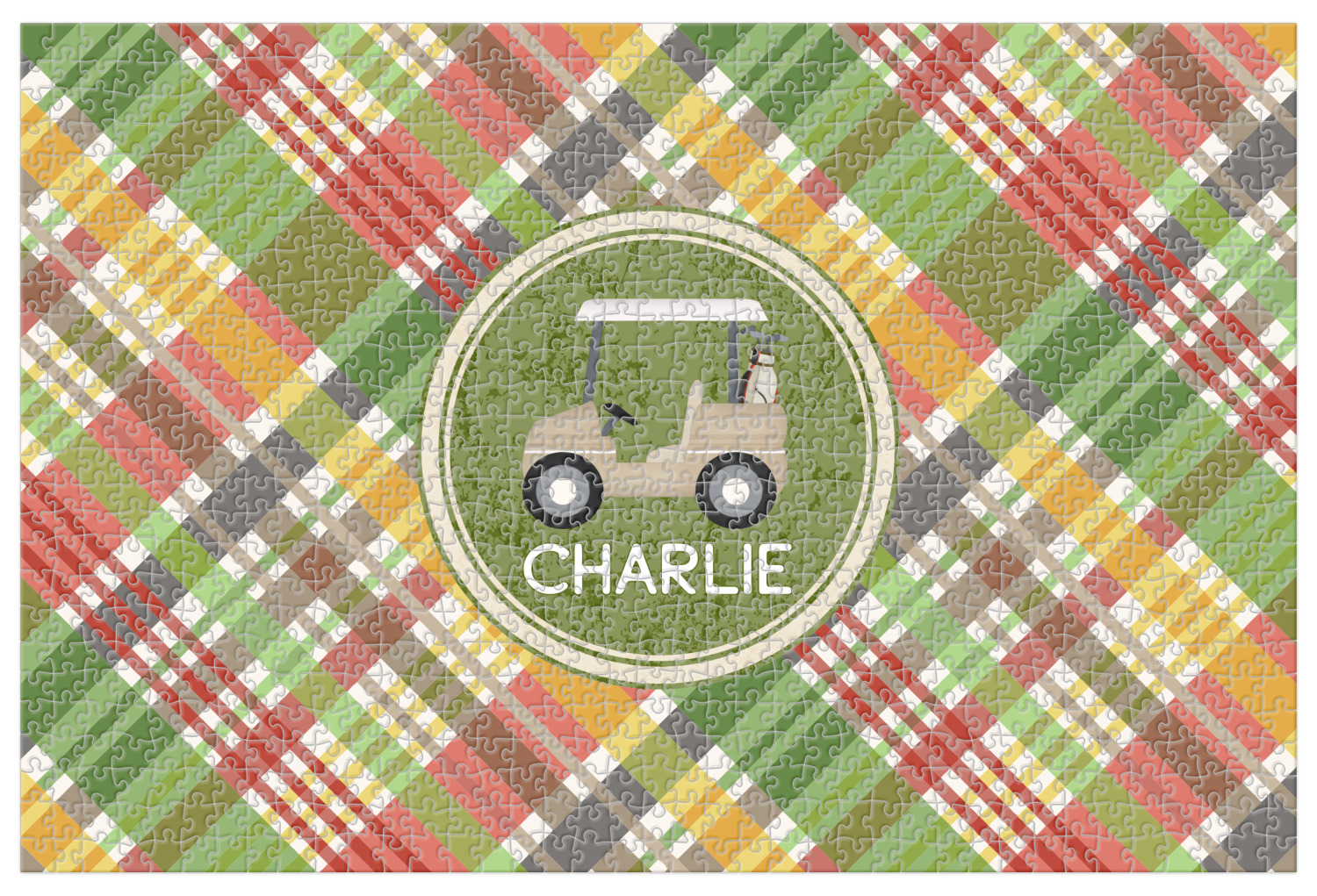 The background in this design is a diagonal plaid that has muted green, red, cream, and yellow. In the center is a fun vintage texture frame with a golf cart illustration and your personalization underneath. The coordinating design has a fun golf ball pattern with a victorious laurel wreath framing your personalization. This is the perfect design for any guy who loves golf.
