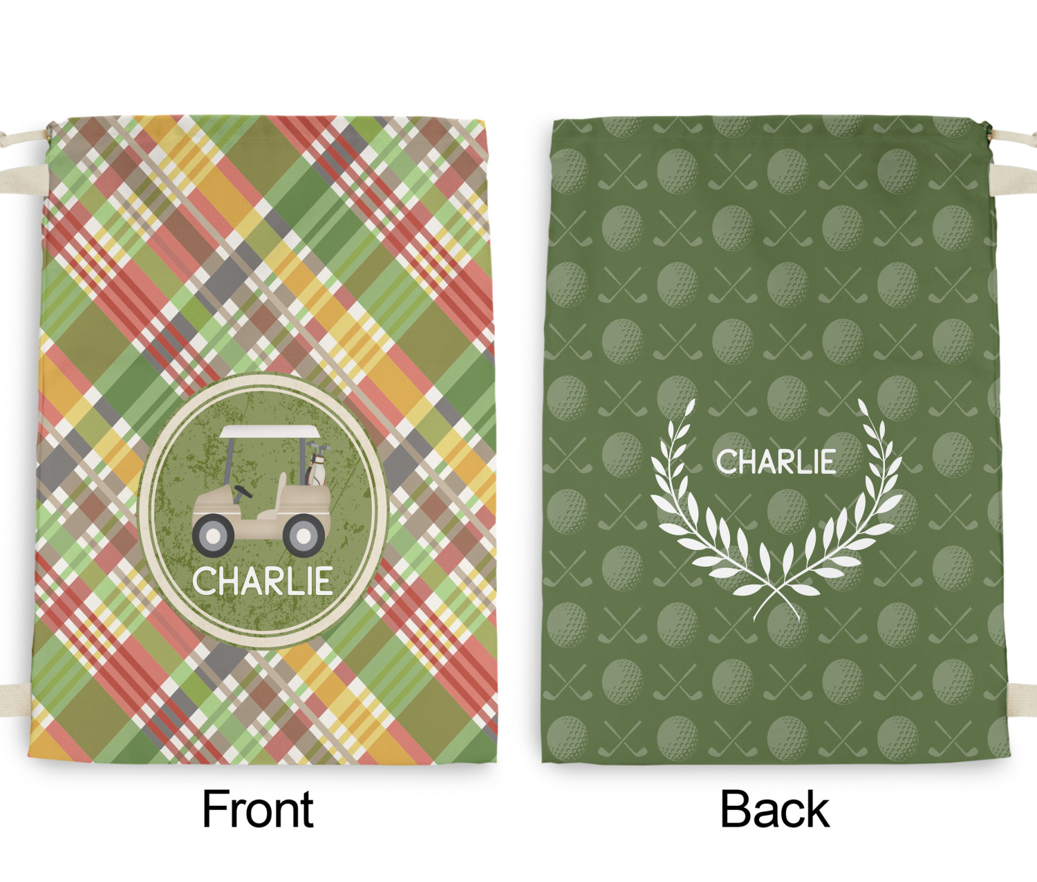 The background in this design is a diagonal plaid that has muted green, red, cream, and yellow. In the center is a fun vintage texture frame with a golf cart illustration and your personalization underneath. The coordinating design has a fun golf ball pattern with a victorious laurel wreath framing your personalization. This is the perfect design for any guy who loves golf.
