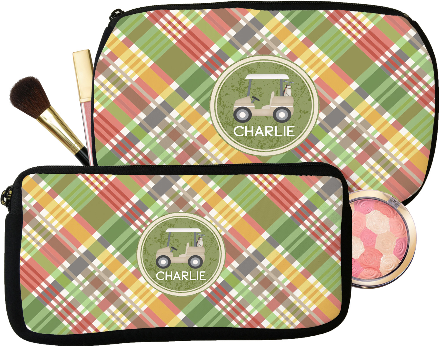 Our personalized makeup bags are available in many different designs, patterns and colors - so you are sure to find one that will love. They are made of neoprene (same material as wet-suits) and thus are water resistant, so spillages in your makeup bag will not end up all over you purse. They are customized on one side and are black on the other side and the zipper is black as well.