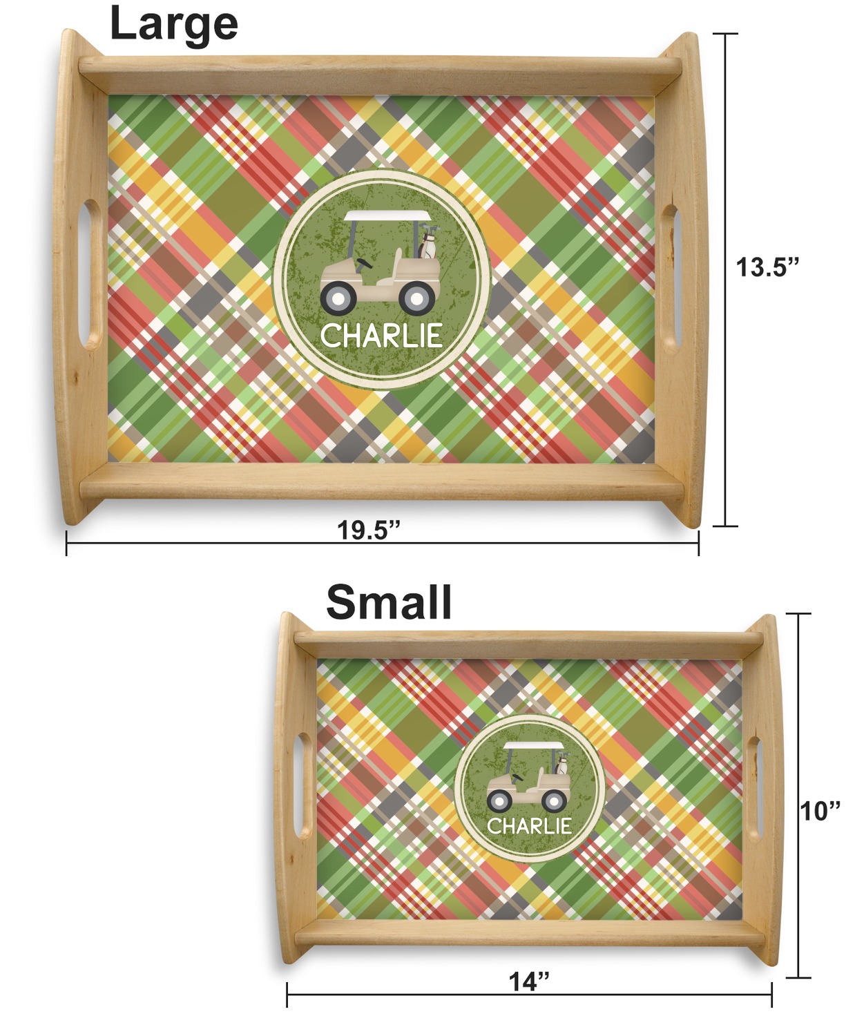 This serving tray with handles features square edges and two rounded sides, creating a very modern look. Each side is fabricated from a beautifully cut, natural wood. The bottom of the interior of the tray displays your customized design in bright, vibrant color. The tray is sold in both a black color and a natural wood look. Each variation of the wood serving tray has two sizes: Small, which is 14" x 10" x 2.25", and Large, which is 19.5" x 13.5" x 2.75".