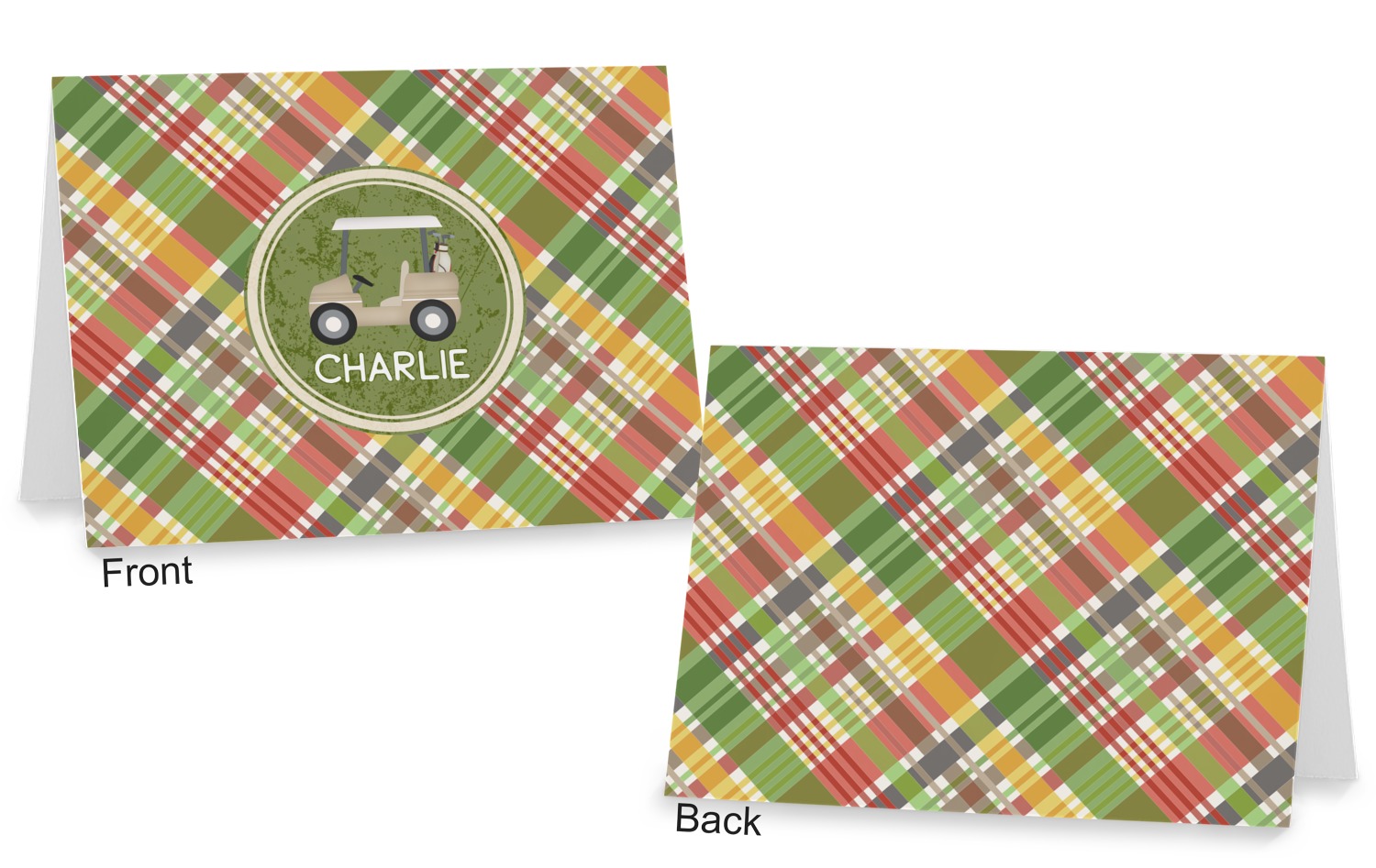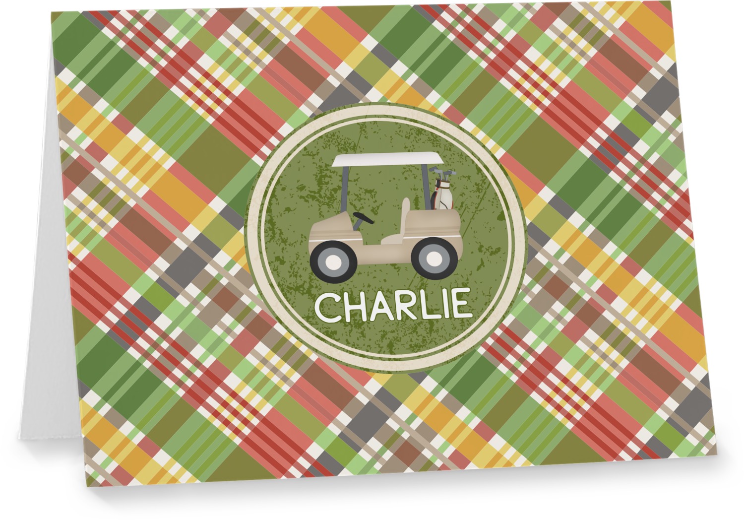 The background in this design is a diagonal plaid that has muted green, red, cream, and yellow. In the center is a fun vintage texture frame with a golf cart illustration and your personalization underneath. The coordinating design has a fun golf ball pattern with a victorious laurel wreath framing your personalization. This is the perfect design for any guy who loves golf.