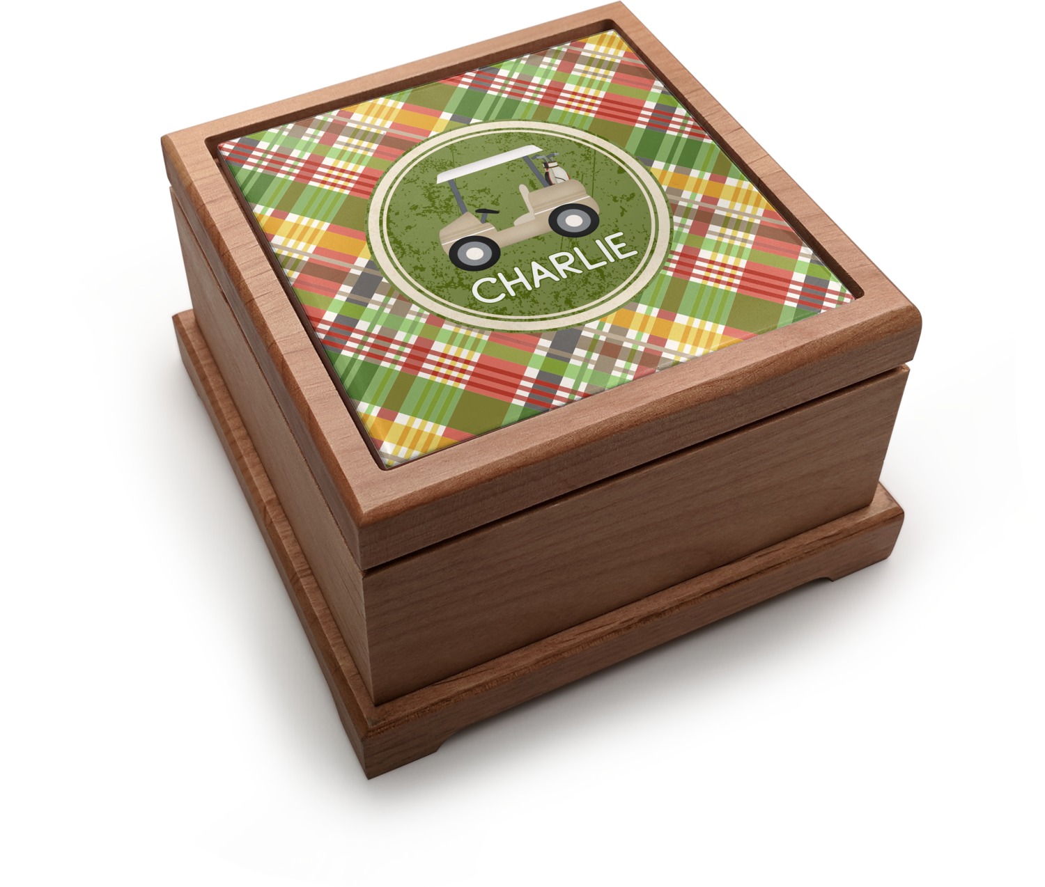 The background in this design is a diagonal plaid that has muted green, red, cream, and yellow. In the center is a fun vintage texture frame with a golf cart illustration and your personalization underneath. The coordinating design has a fun golf ball pattern with a victorious laurel wreath framing your personalization. This is the perfect design for any guy who loves golf.
