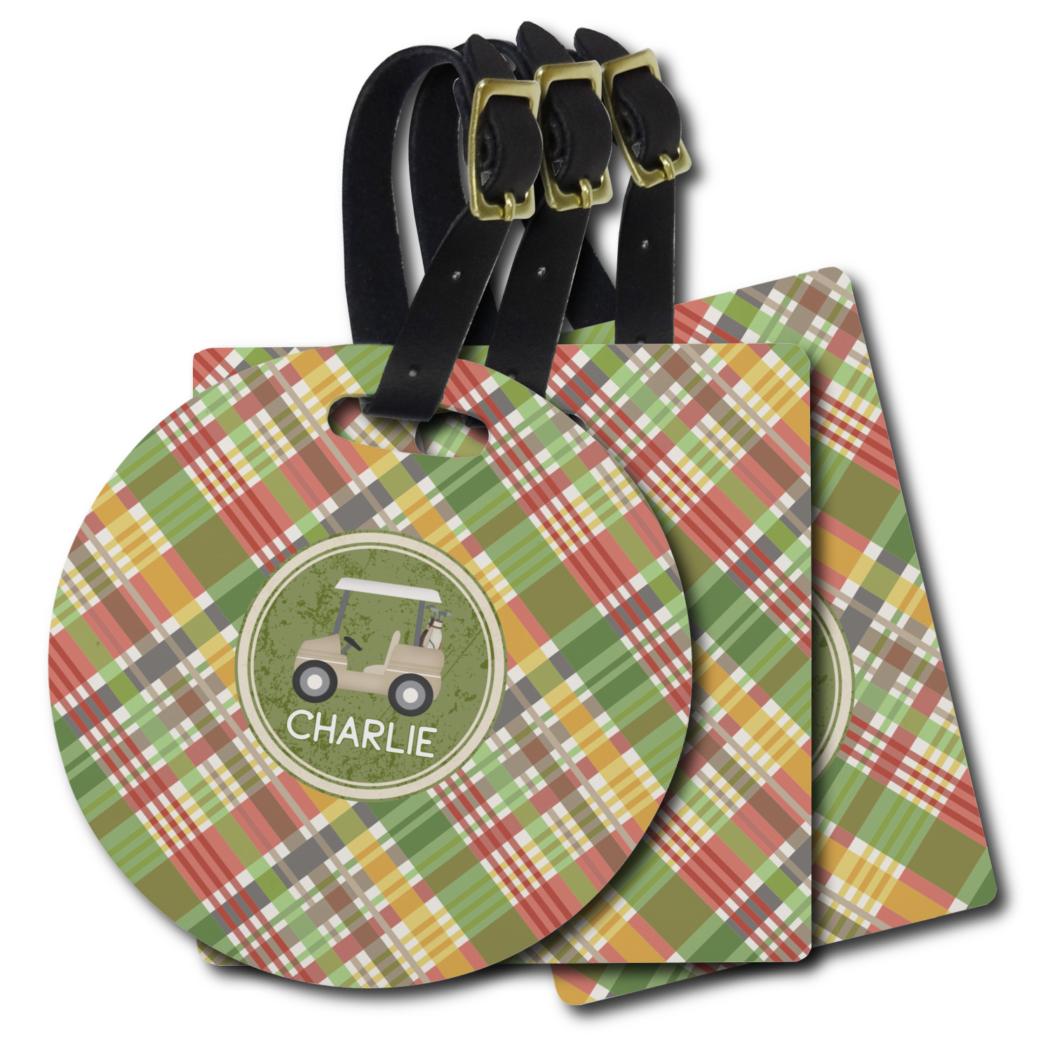 These personalized bag tags are sold in a variety of shapes, so that you may find the product that meets your vision exactly. We sell a round luggage tag, which measures at approximately 4" x 4". Our square luggage tag is about 3.5" x 3.5", while our rectangular version is 2.75" x 4 ".
