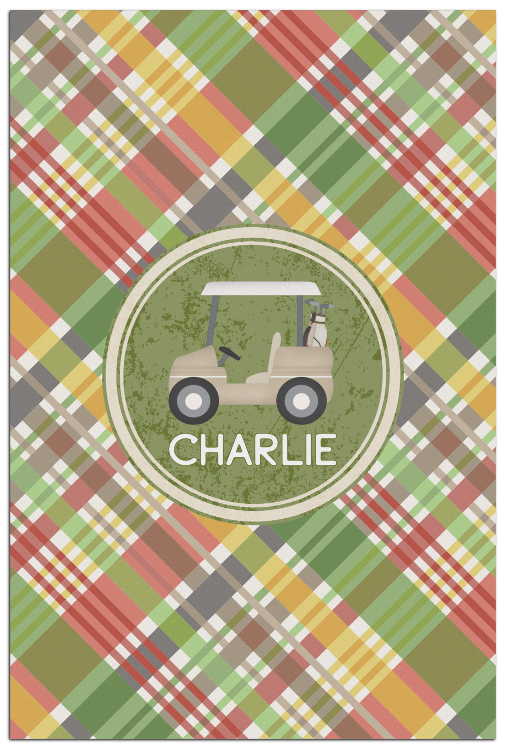 The background in this design is a diagonal plaid that has muted green, red, cream, and yellow. In the center is a fun vintage texture frame with a golf cart illustration and your personalization underneath. The coordinating design has a fun golf ball pattern with a victorious laurel wreath framing your personalization. This is the perfect design for any guy who loves golf.