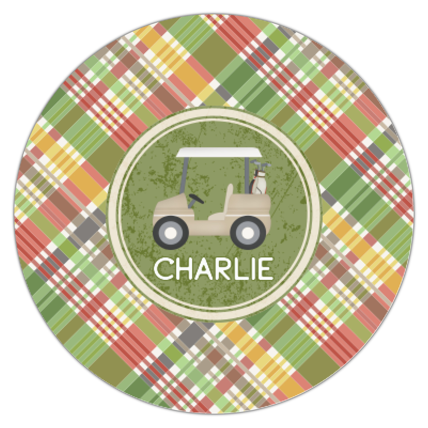 The background in this design is a diagonal plaid that has muted green, red, cream, and yellow. In the center is a fun vintage texture frame with a golf cart illustration and your personalization underneath. The coordinating design has a fun golf ball pattern with a victorious laurel wreath framing your personalization. This is the perfect design for any guy who loves golf.