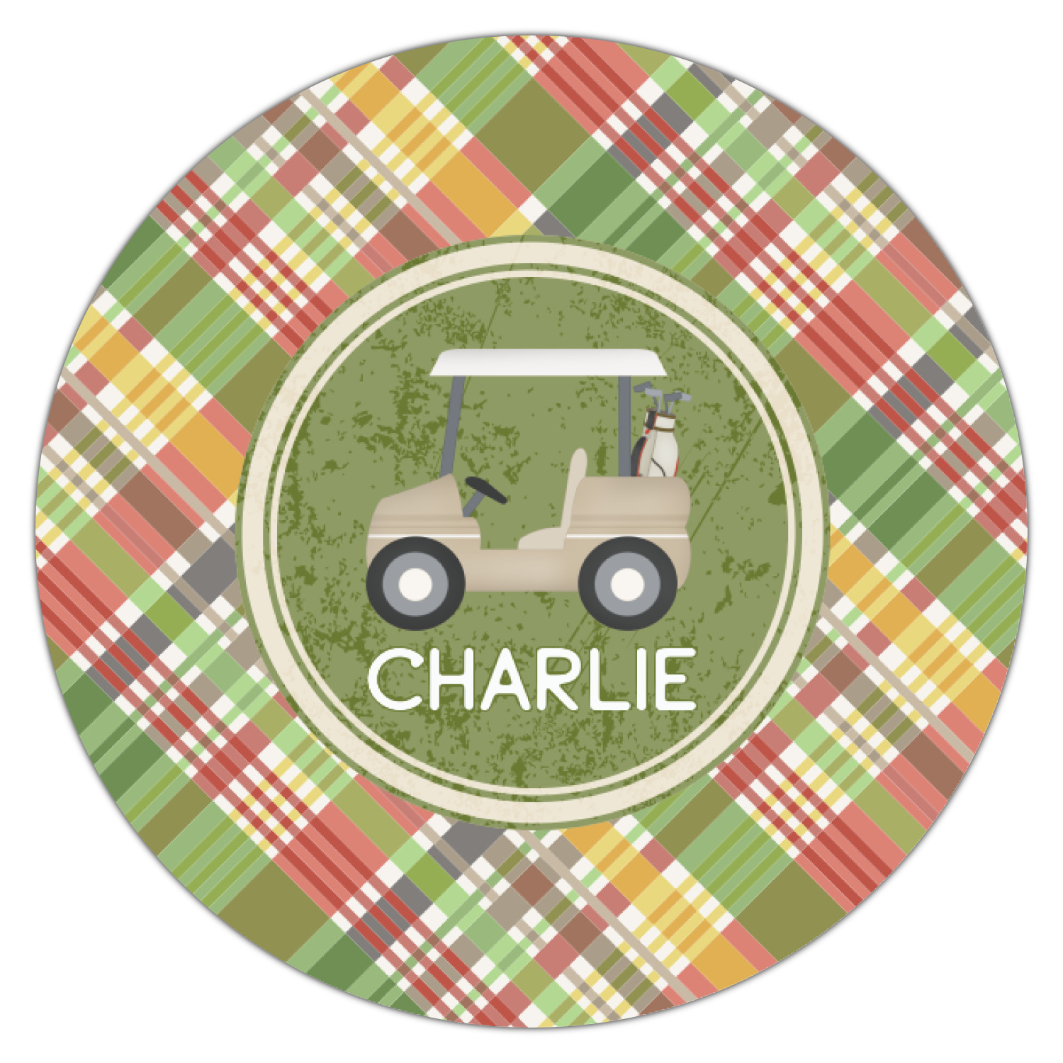 The background in this design is a diagonal plaid that has muted green, red, cream, and yellow. In the center is a fun vintage texture frame with a golf cart illustration and your personalization underneath. The coordinating design has a fun golf ball pattern with a victorious laurel wreath framing your personalization. This is the perfect design for any guy who loves golf.