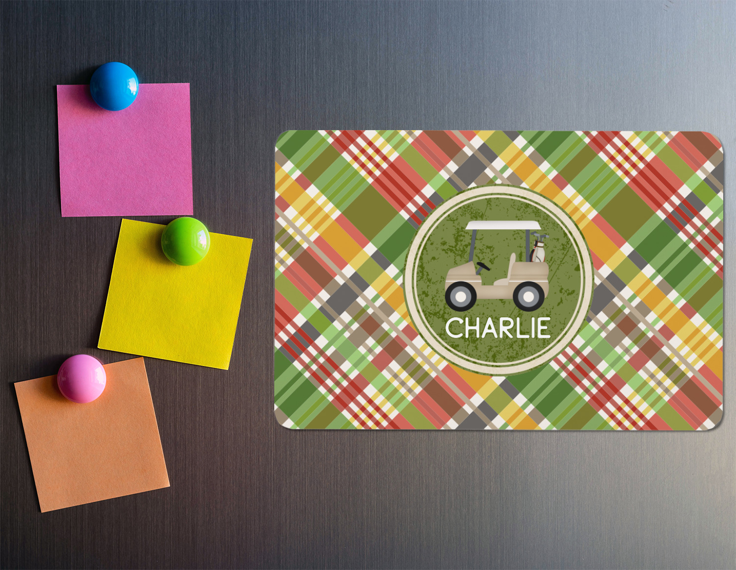 The background in this design is a diagonal plaid that has muted green, red, cream, and yellow. In the center is a fun vintage texture frame with a golf cart illustration and your personalization underneath. The coordinating design has a fun golf ball pattern with a victorious laurel wreath framing your personalization. This is the perfect design for any guy who loves golf.