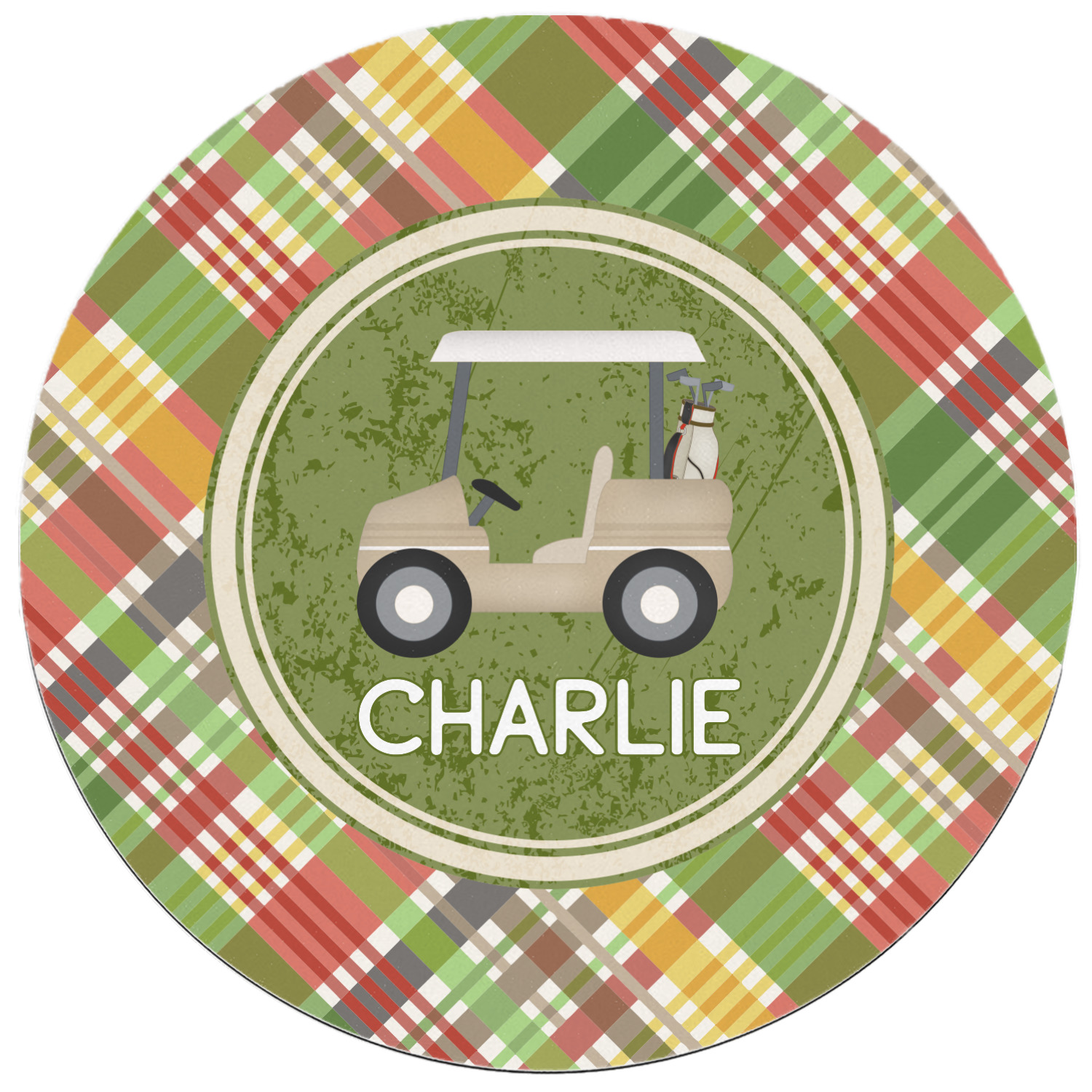 The background in this design is a diagonal plaid that has muted green, red, cream, and yellow. In the center is a fun vintage texture frame with a golf cart illustration and your personalization underneath. The coordinating design has a fun golf ball pattern with a victorious laurel wreath framing your personalization. This is the perfect design for any guy who loves golf.