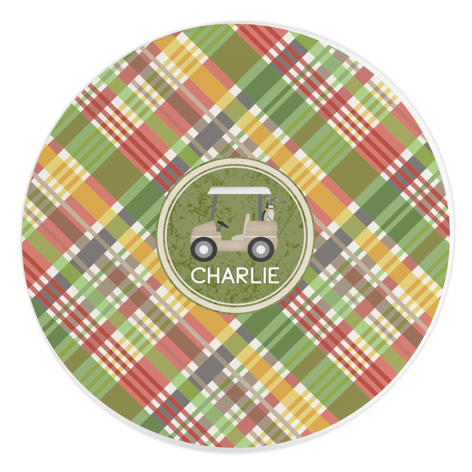 The background in this design is a diagonal plaid that has muted green, red, cream, and yellow. In the center is a fun vintage texture frame with a golf cart illustration and your personalization underneath. The coordinating design has a fun golf ball pattern with a victorious laurel wreath framing your personalization. This is the perfect design for any guy who loves golf.