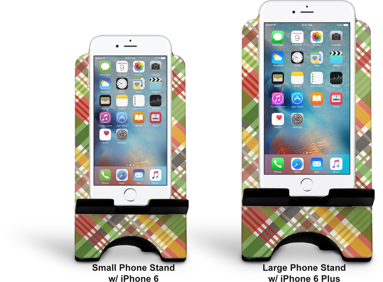 To meet your needs, we offer four variations of this IPhone stand. The backboard of the first version is shaped as a plain, yet sleek rectangle, and is available in two sizes. Our smaller size is approximately 4 by 3.25 by 7 inches, while the larger model is 4 by 3.77 by 8.5 inches. Alongside this model, we also provide you with a more decorative option. The upper part of our second version features a curved edge, for a classy, suave appearance. This phone holder is also sold in two sizes: a smaller version, which is 4 by 3.25 by 7 inches, and our larger model, which is 4 by 3.77 by 8.5 inches. Both models will support large phones, but the larger model is better if you wish to proudly display your personalized design.