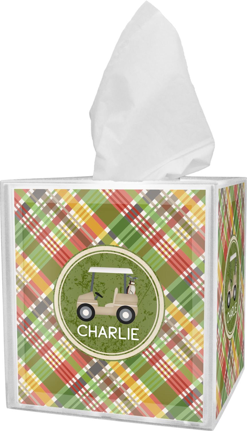 These tissue holders are built from durable acrylic and display your unique personalization on fine-quality vinyl inserts placed within the four sides and top. The box features two pieces, allowing you to easily switch out tissue boxes. On the sides, youll find ridges that ensure the top and base fit securely in place. The bottom of these tissue box holders has four, rubber, non-slip pads to prevent the box from scuffing any surface you decide to display it on. Each box can fit a standard 5 by 5-inch box of tissues.