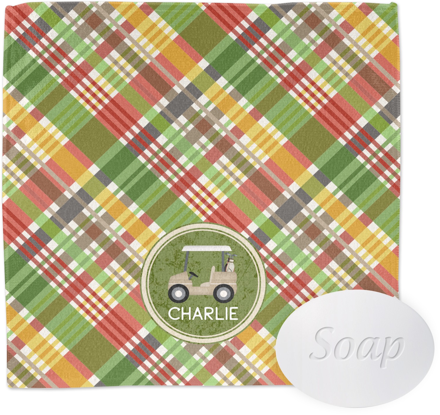 The background in this design is a diagonal plaid that has muted green, red, cream, and yellow. In the center is a fun vintage texture frame with a golf cart illustration and your personalization underneath. The coordinating design has a fun golf ball pattern with a victorious laurel wreath framing your personalization. This is the perfect design for any guy who loves golf.