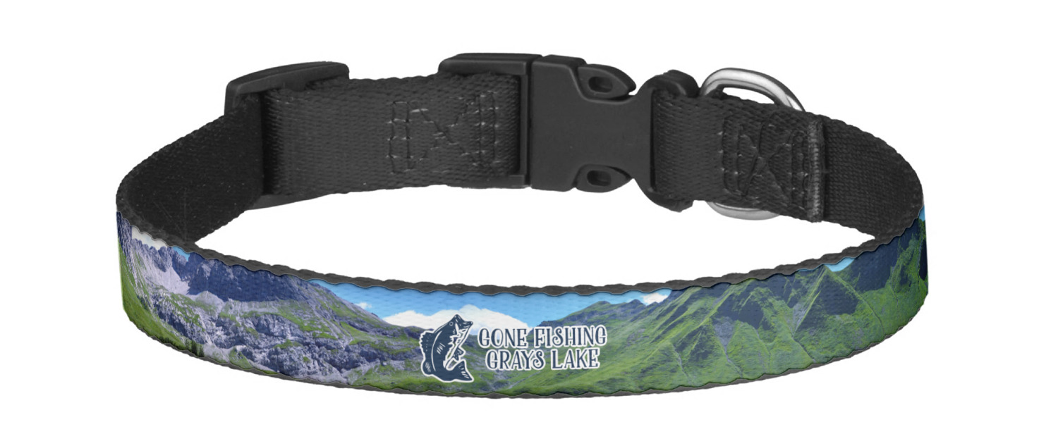 This sturdy collar, made from a durable nylon weave, will outlive your dog's episodes of excited tugging and pulling. Courtesy of its thick plastic buckle and adjuster, this collar is adjustable and accommodating of any dog. Structurally, the collar is a single piece of nylon weave that is sewn together, and features a solid metal loop where you can attach a leash or dog tag. We print and display your dog's name and pattern across the middle of the personalized dog collar.