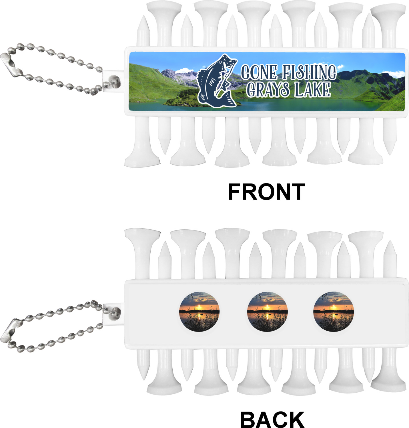 With 12 tees on a lightweight, portable key chain, it almost ensures a great 18 holes. Our tees are made of white plastic and are a little over 2". Design the front and the back of the golf tee holder. Pick from over a hundred designs, colors, and personalization styles! The set even comes with three removable ball markers as well!