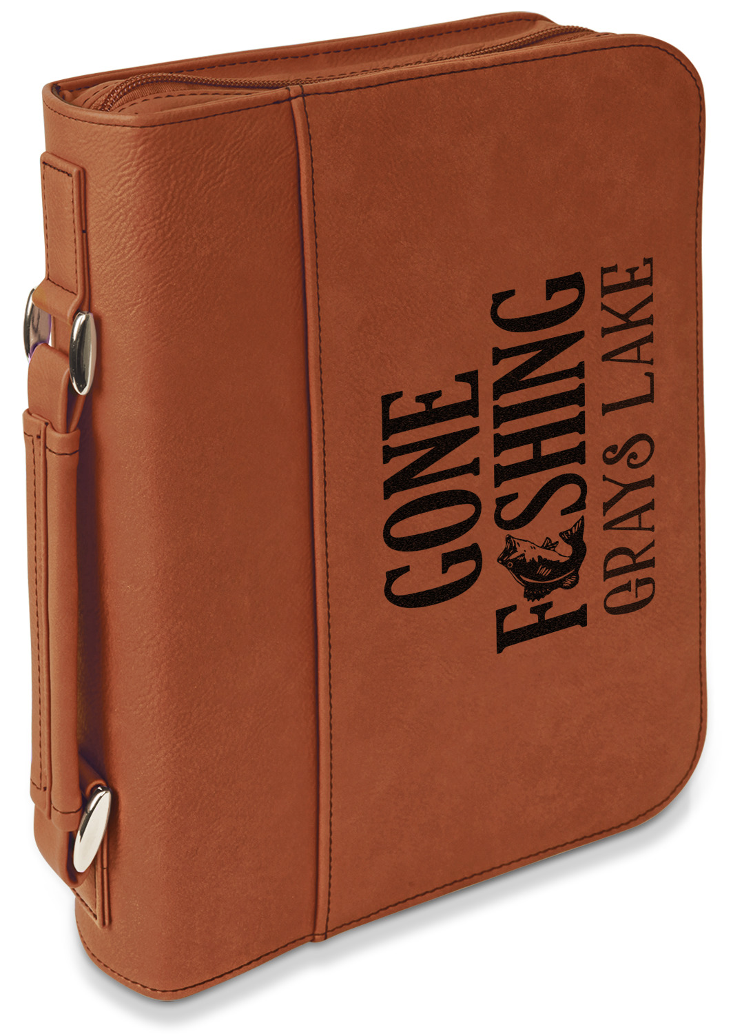 These book covers are fabricated from a fine leatherette in a warm, cognac shade of brown. A wide pocket spans across the front of the book jacket [2,400] and can store any loose papers or notes that you wish to keep. The interior of this personalized Bible cover includes slots on both sides to house the covers of your Bible, and keep it in place. The inside of the spine has a small elastic band to secure a pen. A zipper lines three sides of the cover, while the fourth side features a reinforced handle that allows for easy transport of your enclosed book.