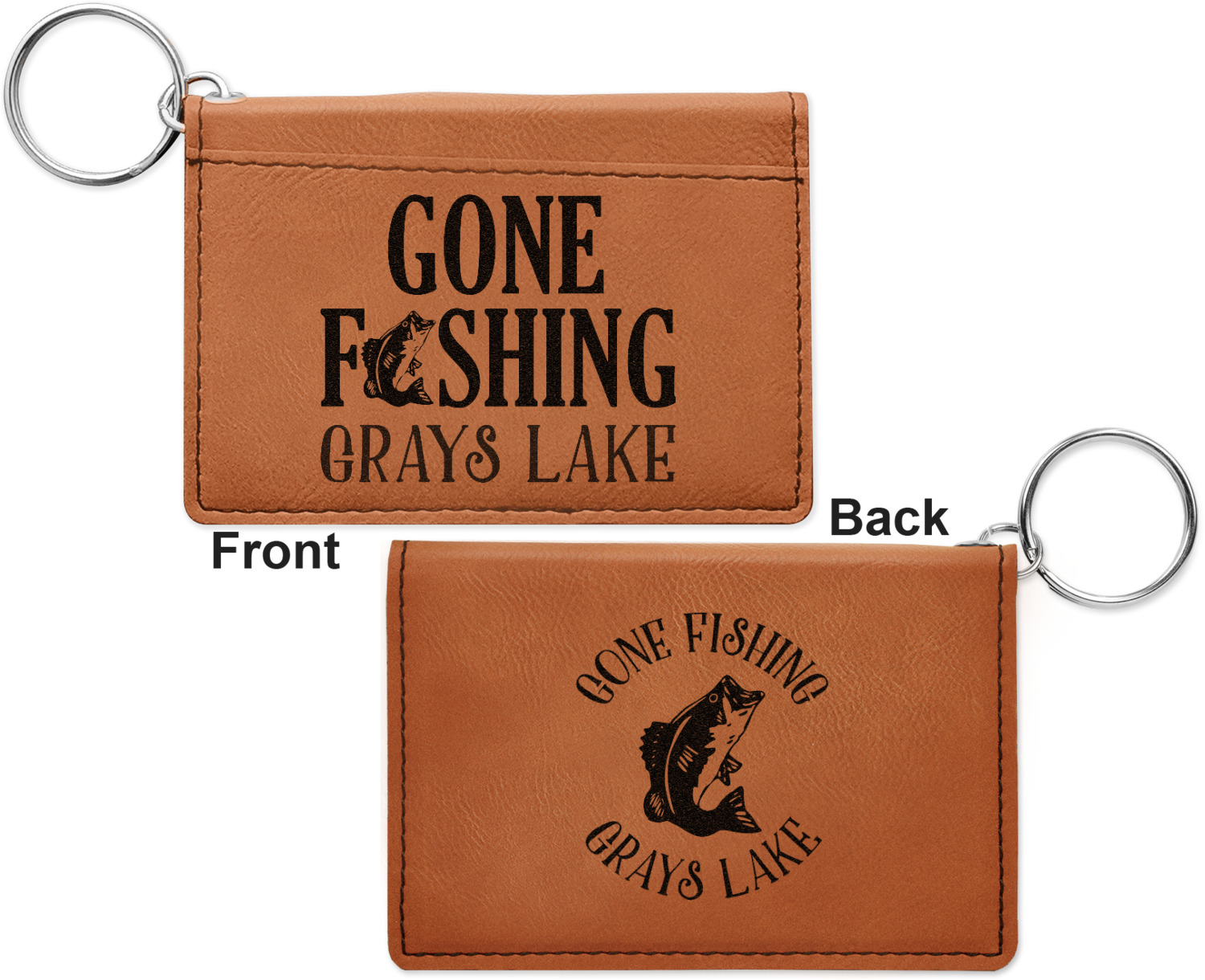 These ID wallet keychains features three pockets on the inside to accommodate your ID and your most frequently used cards. Another pocket occupies the front of the wallet's exterior, and can hold some cash or another card. The wallet is accompanied by a thick metal ring for easy attachment to a belt clip or purse. Each card holder keychain measures at 4.25 by 3 inches and is a beautiful, cognac, medium-brown shade. The personalized monogram, font, or graphic of your choosing is laser engraved into the surface of the wallet, creating a black imprint. We sell these ID wallets in two models: single sided and double sided engraving.