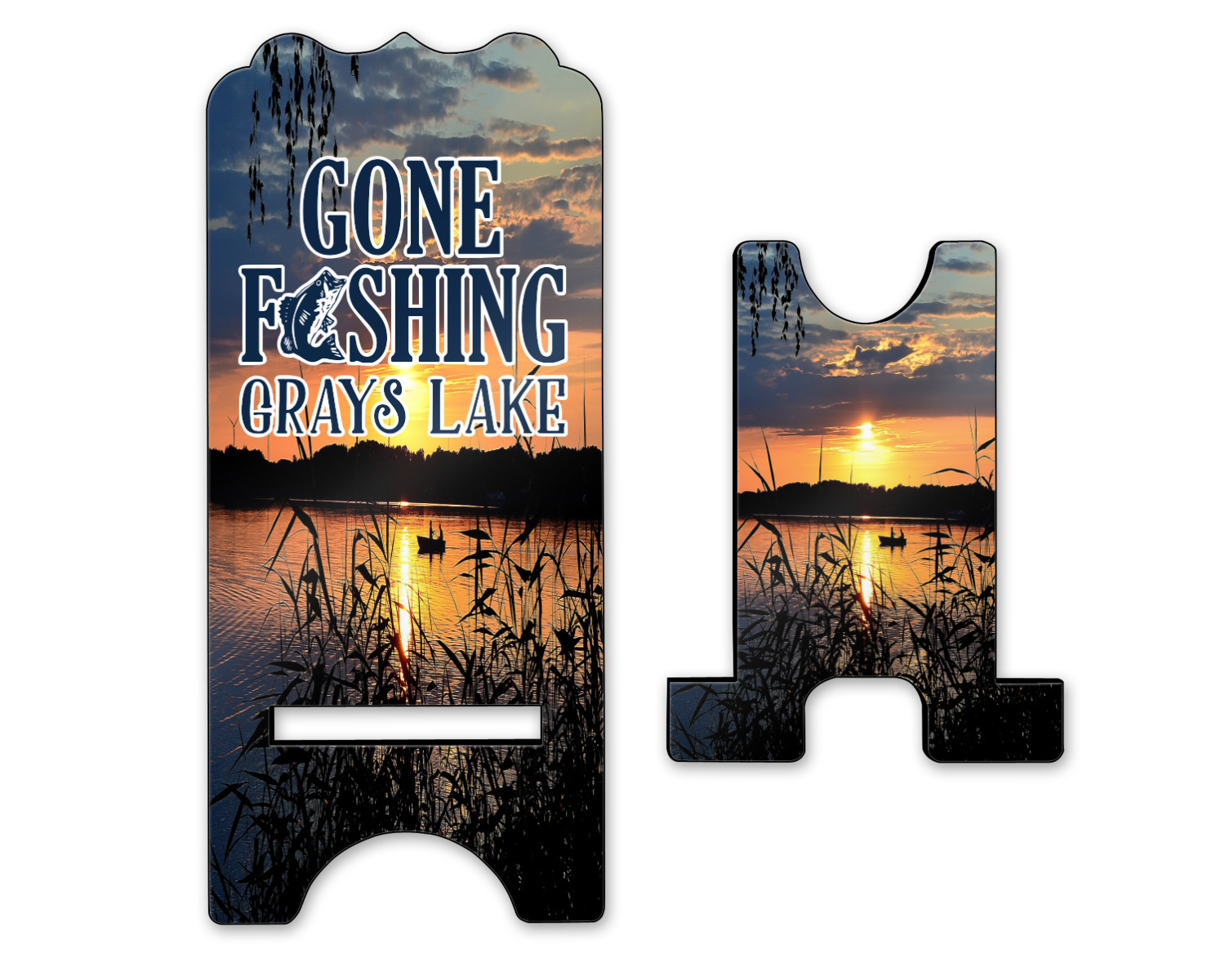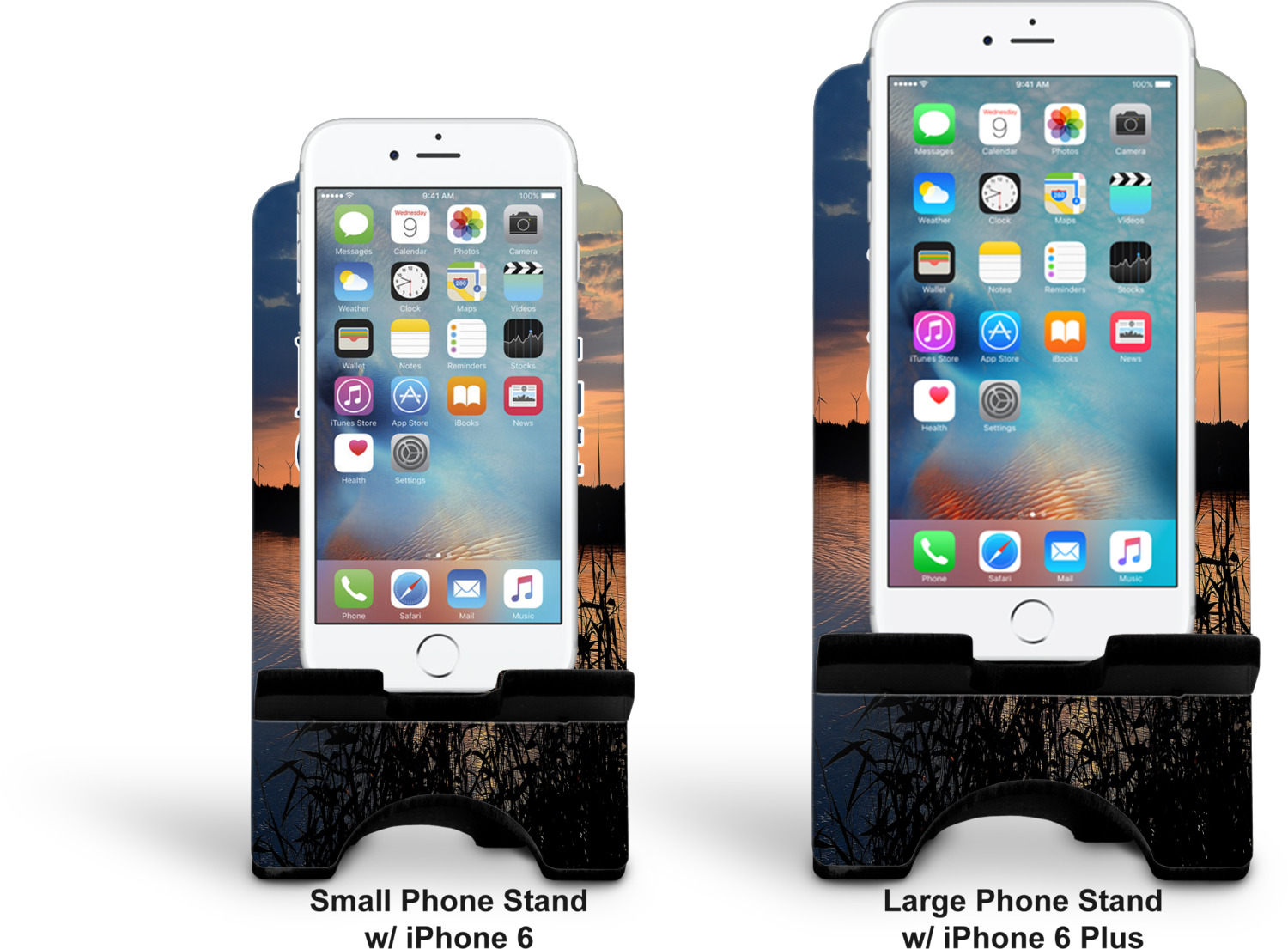 To meet your needs, we offer four variations of this IPhone stand. The backboard of the first version is shaped as a plain, yet sleek rectangle, and is available in two sizes. Our smaller size is approximately 4 by 3.25 by 7 inches, while the larger model is 4 by 3.77 by 8.5 inches. Alongside this model, we also provide you with a more decorative option. The upper part of our second version features a curved edge, for a classy, suave appearance. This phone holder is also sold in two sizes: a smaller version, which is 4 by 3.25 by 7 inches, and our larger model, which is 4 by 3.77 by 8.5 inches. Both models will support large phones, but the larger model is better if you wish to proudly display your personalized design.