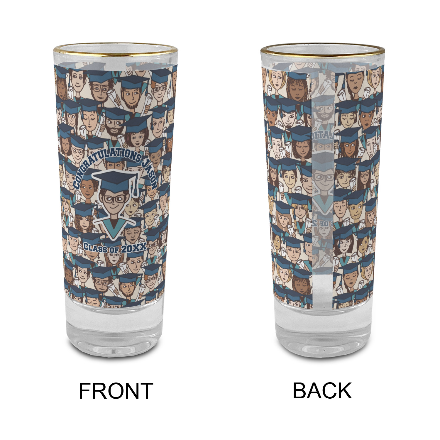These glass shooter glasses are printed in full color with the design of your choice. These are a tall shooter 2 oz size and stand 4" tall. The print is a full wrap design to boldly display your personalization.