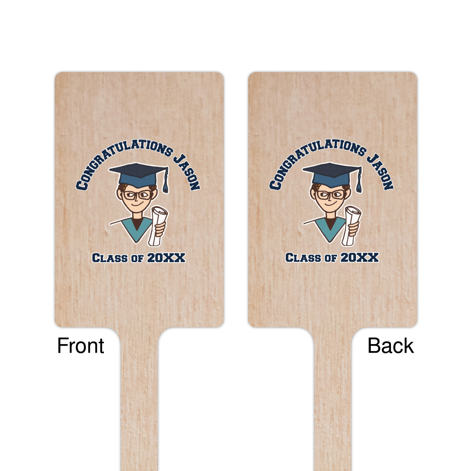 For our design, we chose the layout with a single background & a graphic & text personalization style. We chose a boy graduate as our graphic and added congratulations and his class year as the personalization text. We have many of the other graduates from the background in our system, so you can select a graduate that resembles your graduate more closely. You can also customize the graduate more by changing the graduate's skin, hair & stole colors.