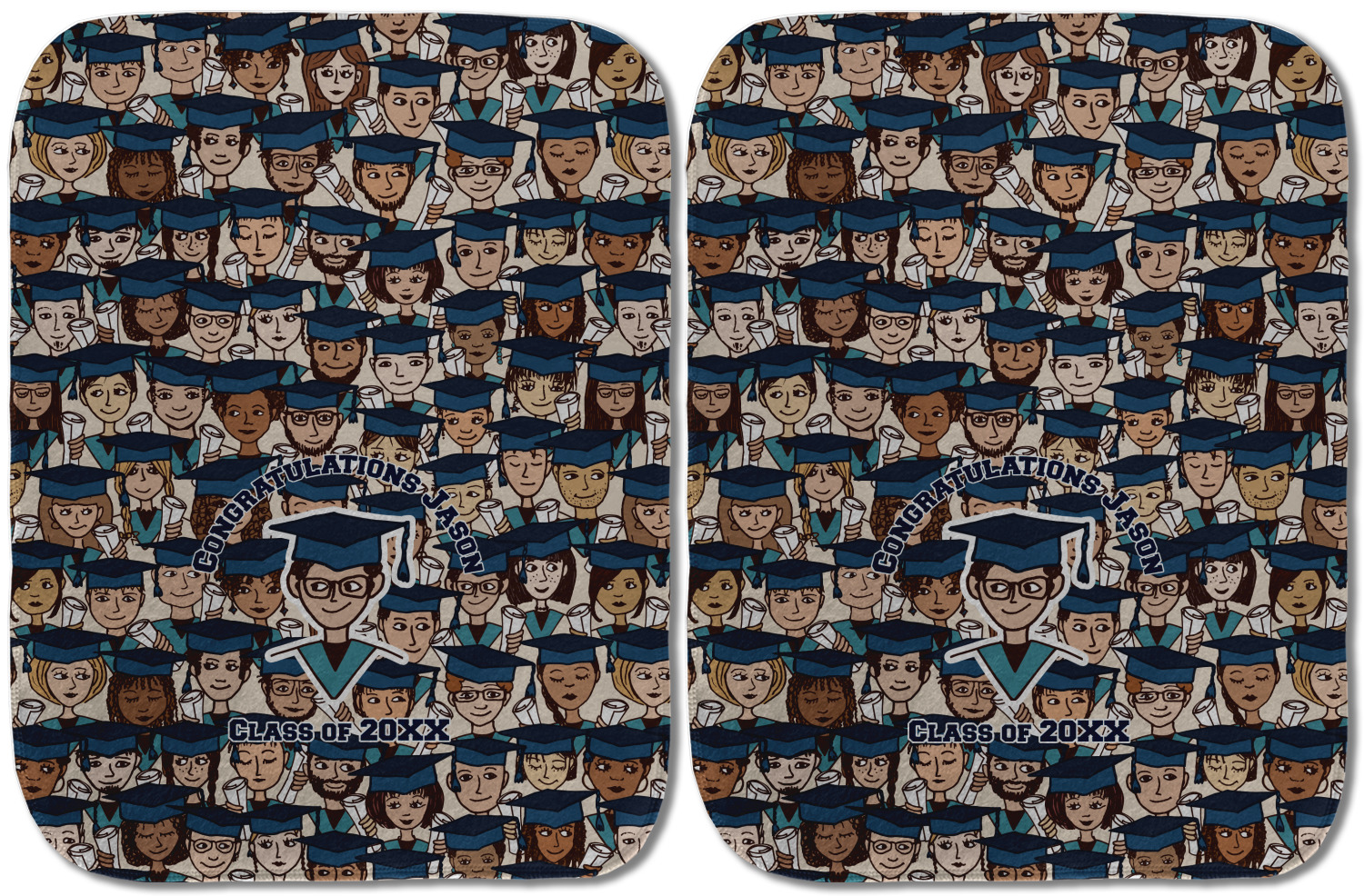 This graduation design depicts a classroom of graduating students all wearing their caps and gowns and holding a diploma in their hands. You can change the color of the mortarboard caps and the color of the stoles to suit your needs.