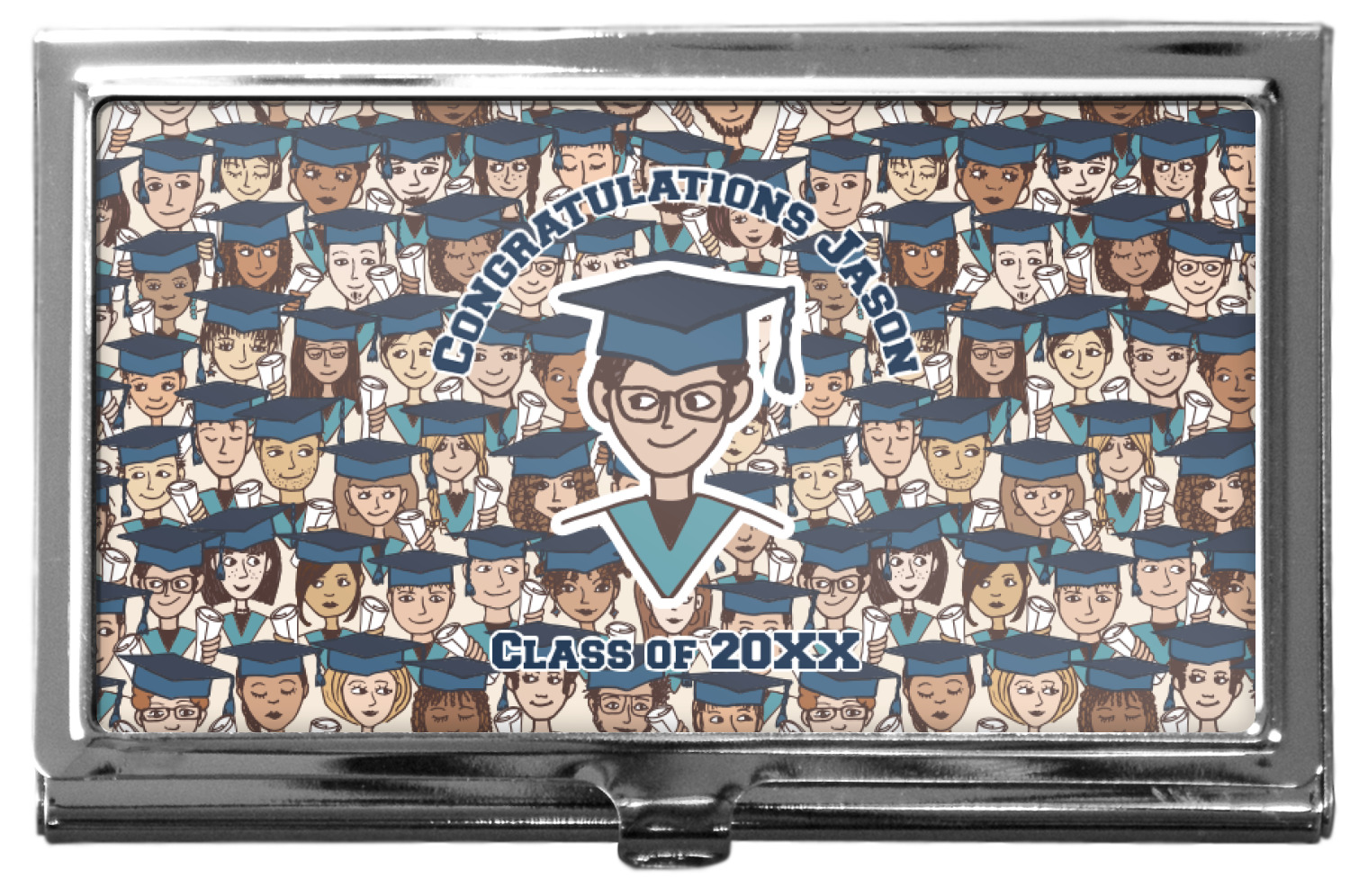 Our personalized business card holders are built from a robust, stainless steel and shaped into a sleek rectangle. At 3.75" x 2.5", and 0.25" thick, this nifty accessory holds up to 12 to 15 business cards, depending on the thickness of the cards themselves. Regardless, the skinny style makes it the perfect fit for your purse or pocket. The lid of your custom business card holder features a protruding tab to open and close your holder with a snap. To protect the mint condition of your cards, the interior of this metal business card holder is lined with a soft, felt fabric. We print your personalized design across the face of the lid.