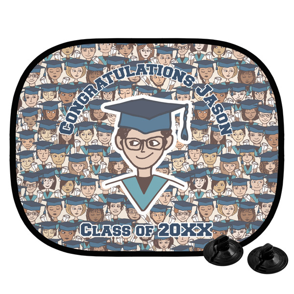 Our custom car sun shade is fabricated from a polyester netting that manages to block out most harsh rays, while still allowing some light to come through. A metal ring encircles the polyester netting, which grants durability and stiffness to the shade. We print your personalized design on the entire surface of the product. Two black suction cups accompany this product; the pair clip onto either side of the shade and allows for easy attachment and removal. Each shade measures at 17.25" x 14.25". We suggest that you measure the side windows of your car to ensure that this car window shade is a proper fit.